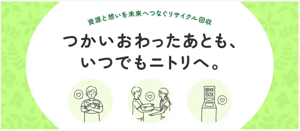 ニトリでは、ご愛用した商品を「つかいおわったあと」も、“いつでも”お持ち込みいただき、資源につなげることで、安心してつぎのお買い物を楽しんでいただきたいと考えています。