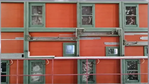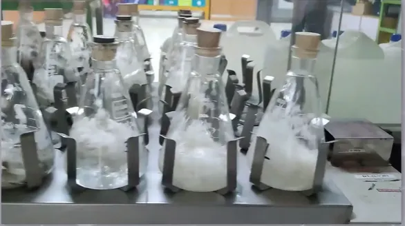 試験フラスコを載せた台が左右に素早く動き、再製品化するのに適正な羽毛を選定します。