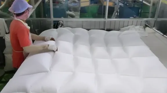 ④ 再生羽毛をつかって、羽毛ふとんをつくります。