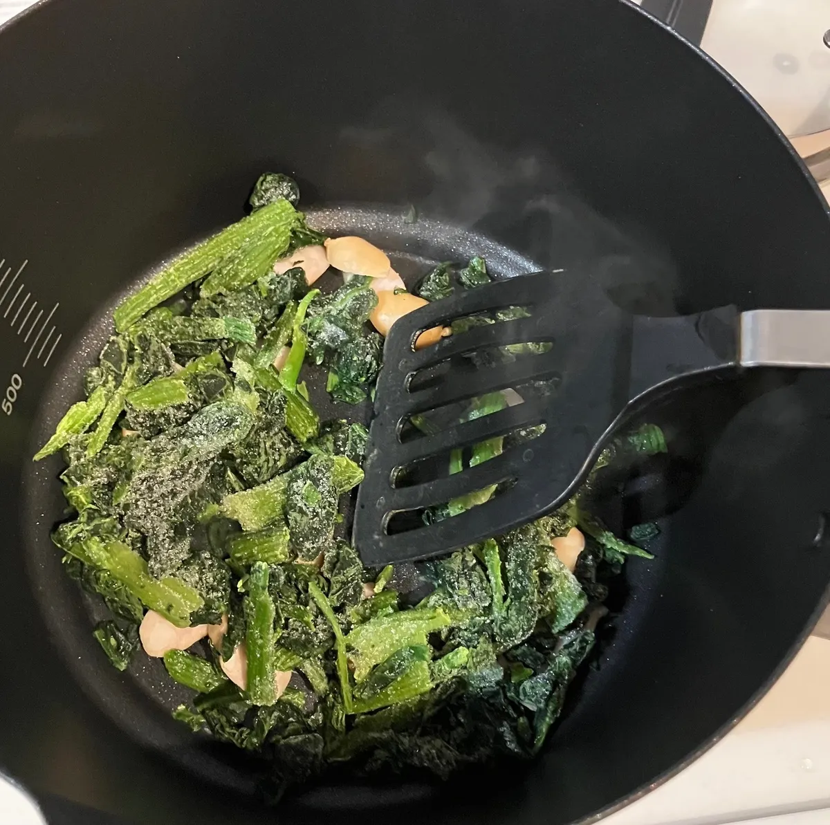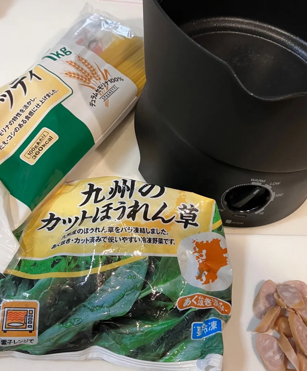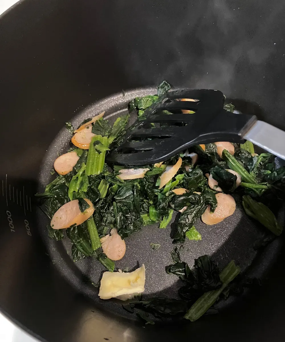 ほうれん草とウィンナーをマルチ調理ポットで炒める