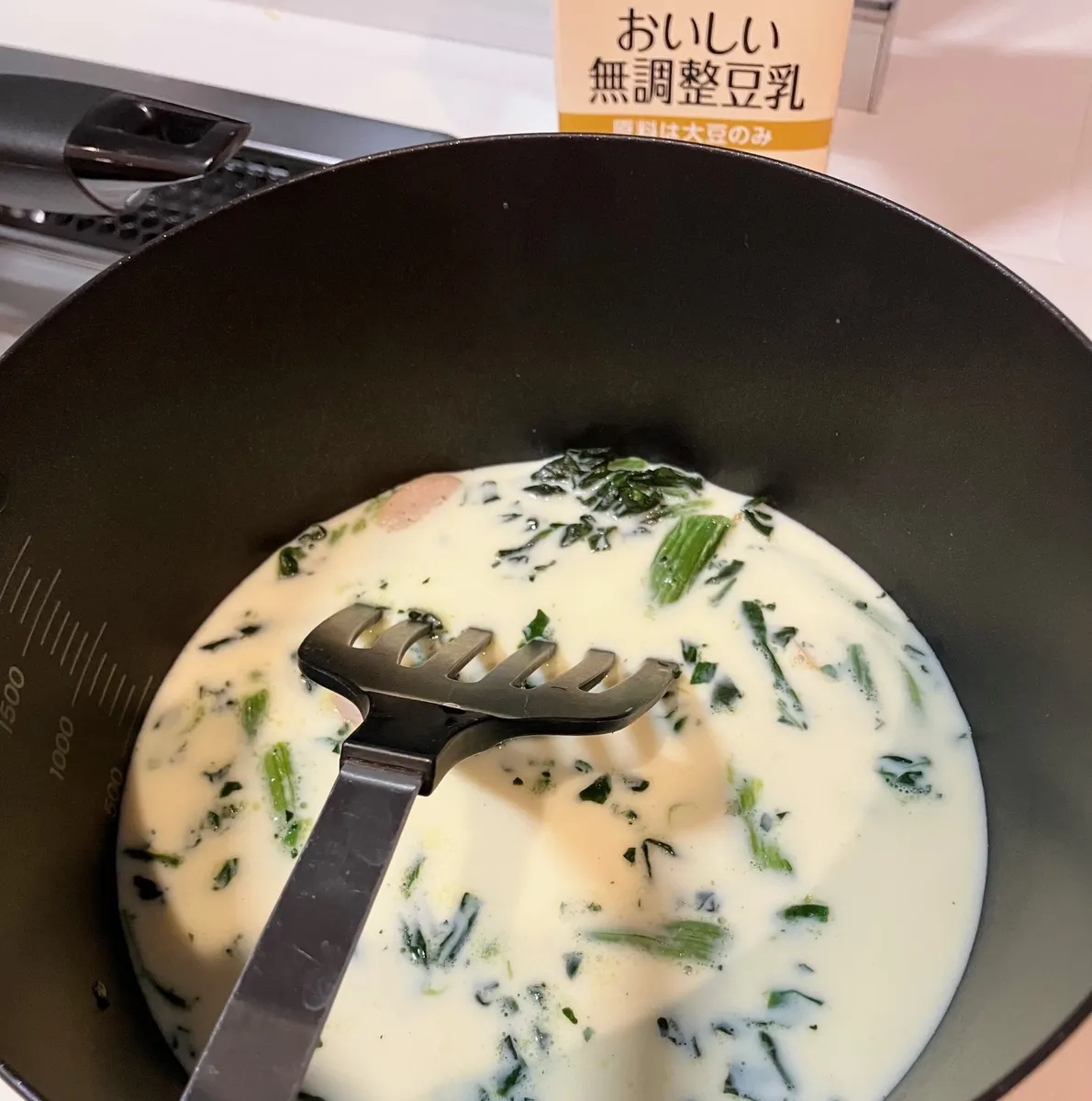 バターがなじんだら 豆乳を投入😆