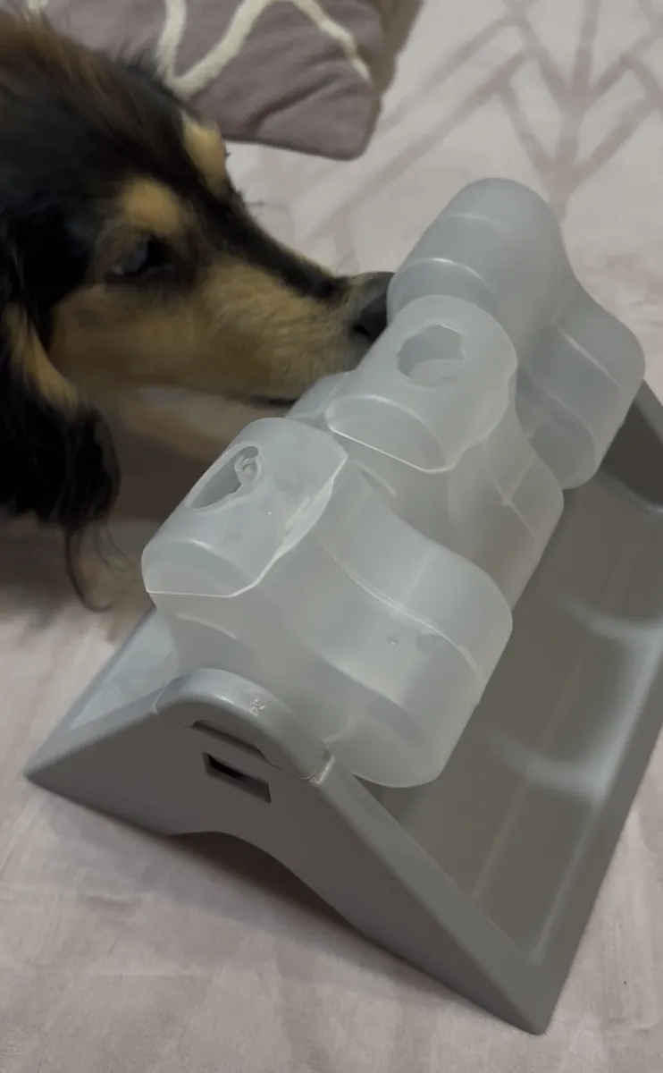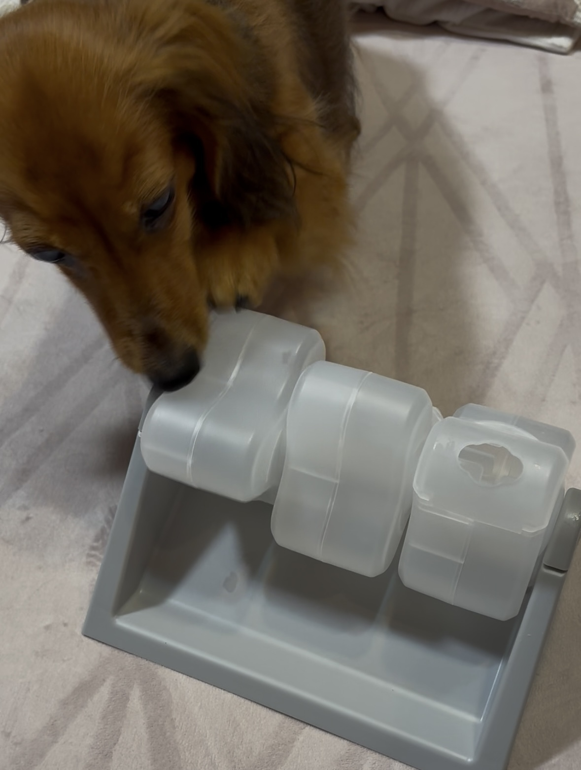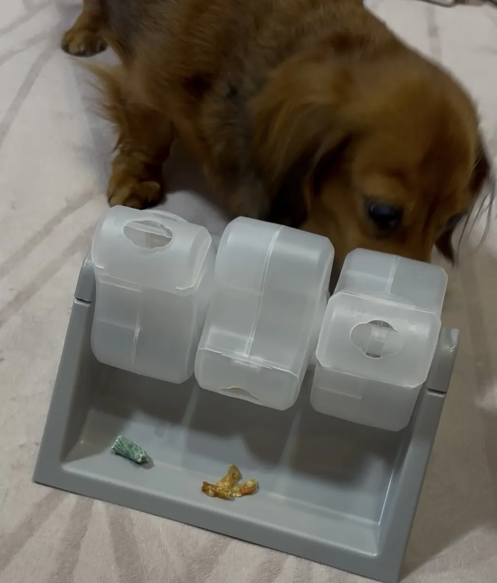 3箇所オヤツを入れられるところがあり、お手手やお鼻でクルクル回すと、オヤツが出てきます🍬🍭🍩(必死なのでブタ鼻になっておりますฅ՞•🐽•՞ฅブー)