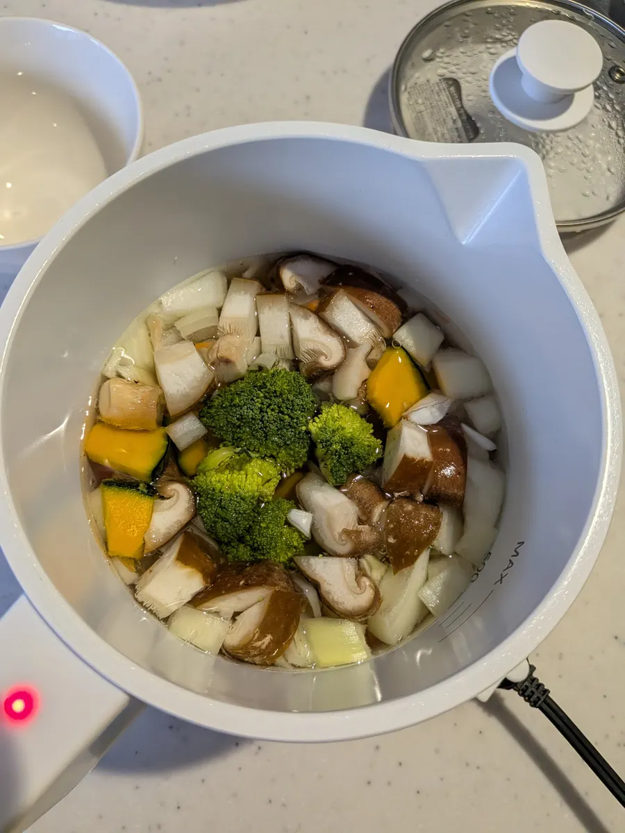 ③沸騰したら弱にして固形のコンソメスープの素を入れ野菜が柔らかくなるまで煮ます。