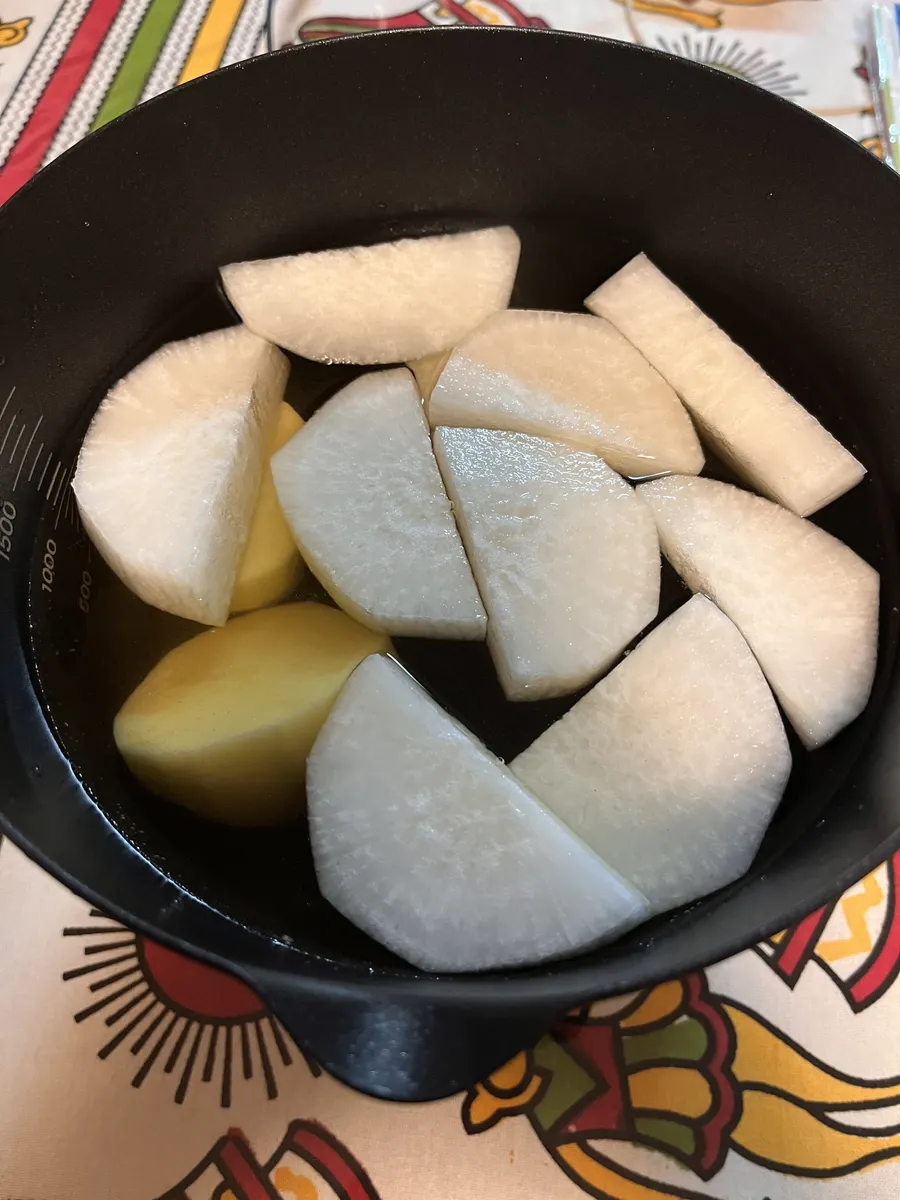 はじめに火が通りにくいものから、ポットに入れます。大根、じゃがいもなど。