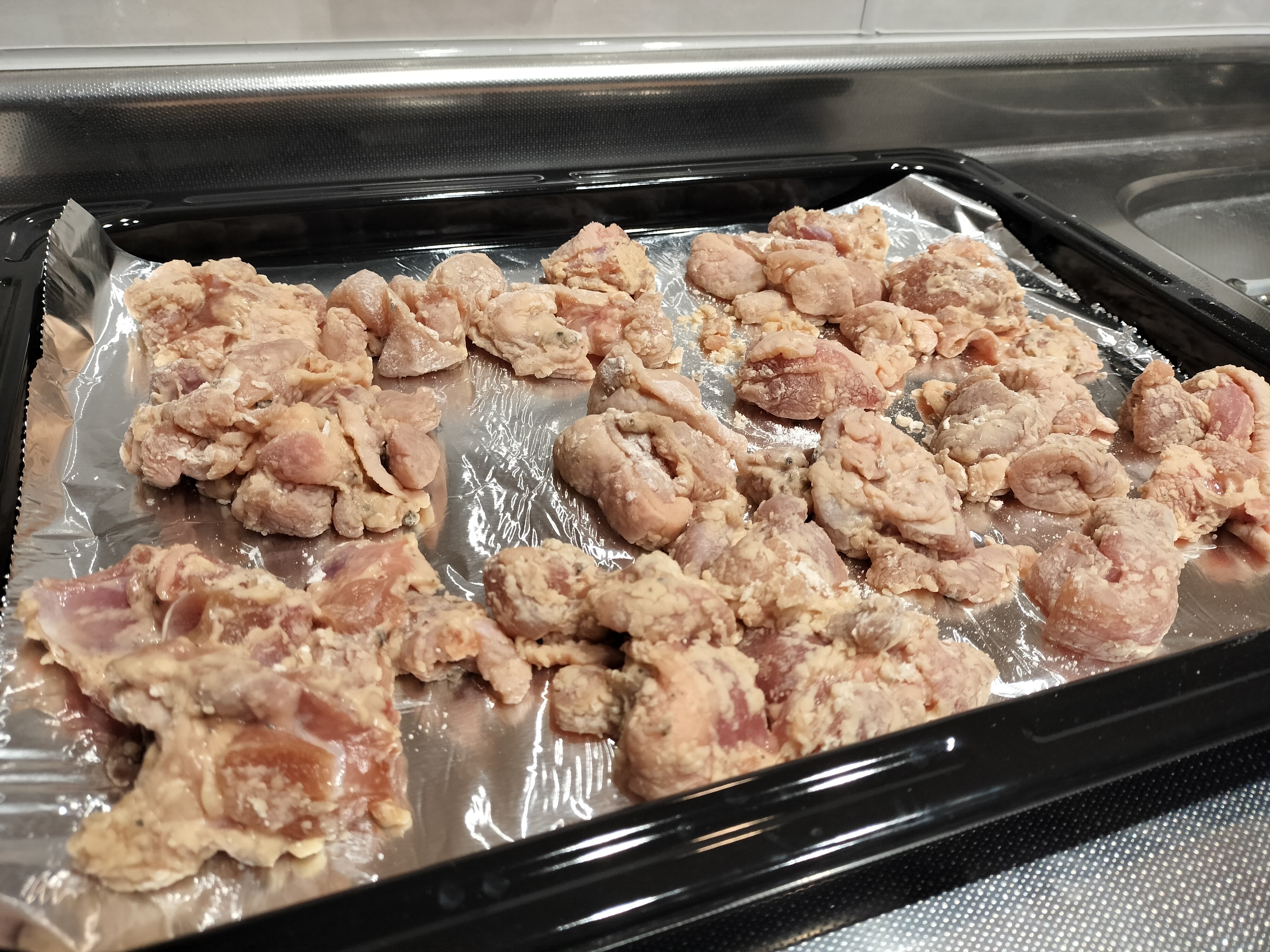 粉はまんべんなく薄く振るのがポイントです。1回目は粉が多すぎて少し粉が残ってたのとペチャっとした唐揚げになりました。