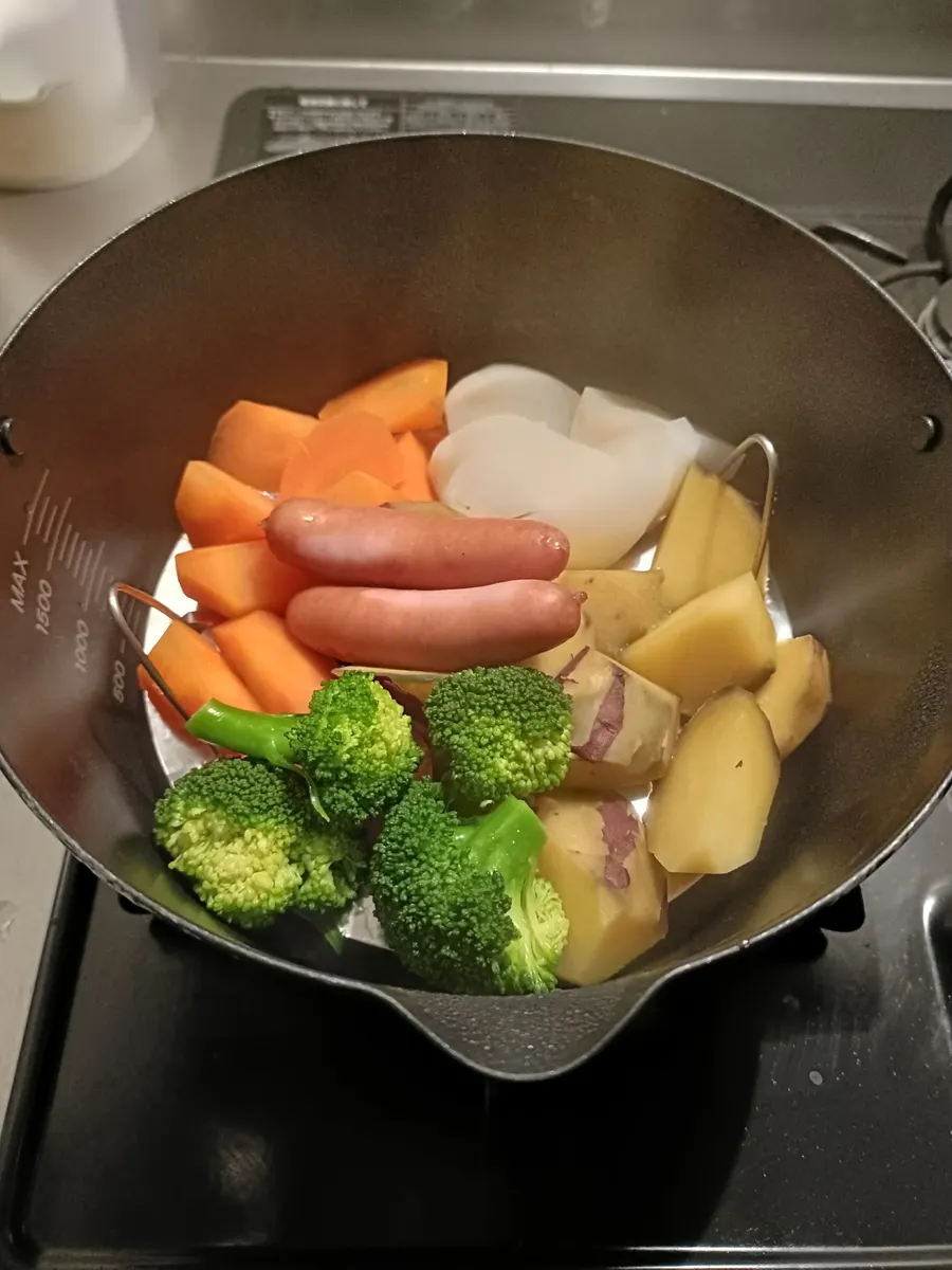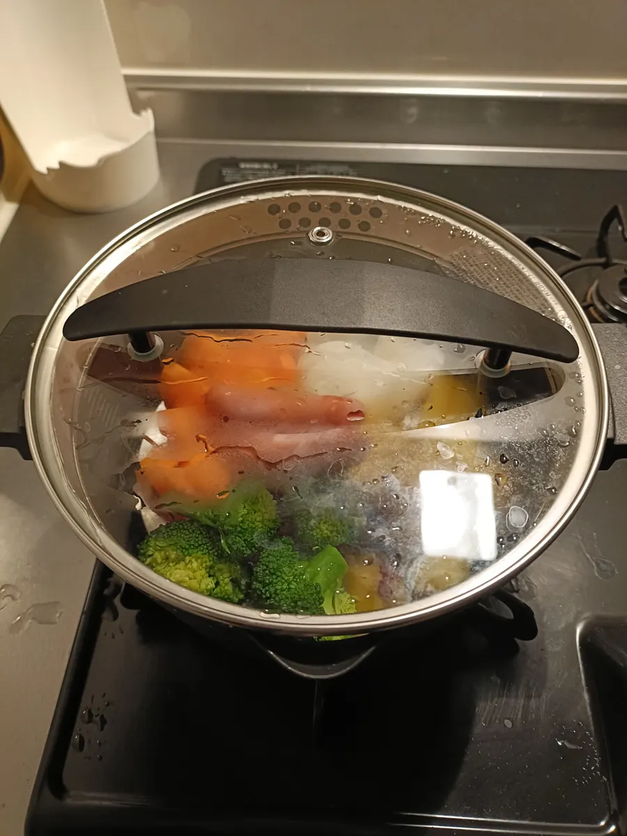 先に硬めの野菜入れて、ある程度火が通ってからブロッコリー入れるのがおすすめです!(ブロッコリーは3分くらいで平気)