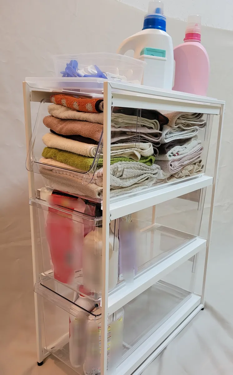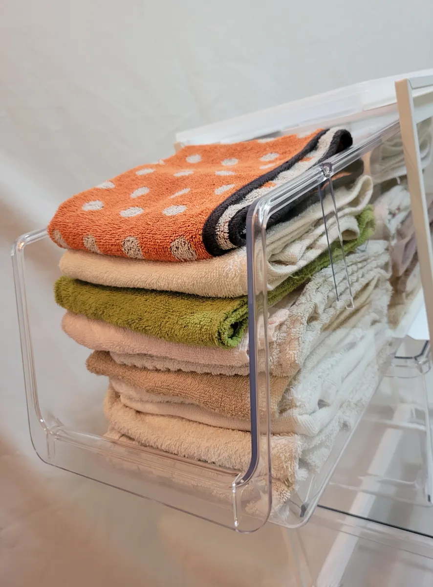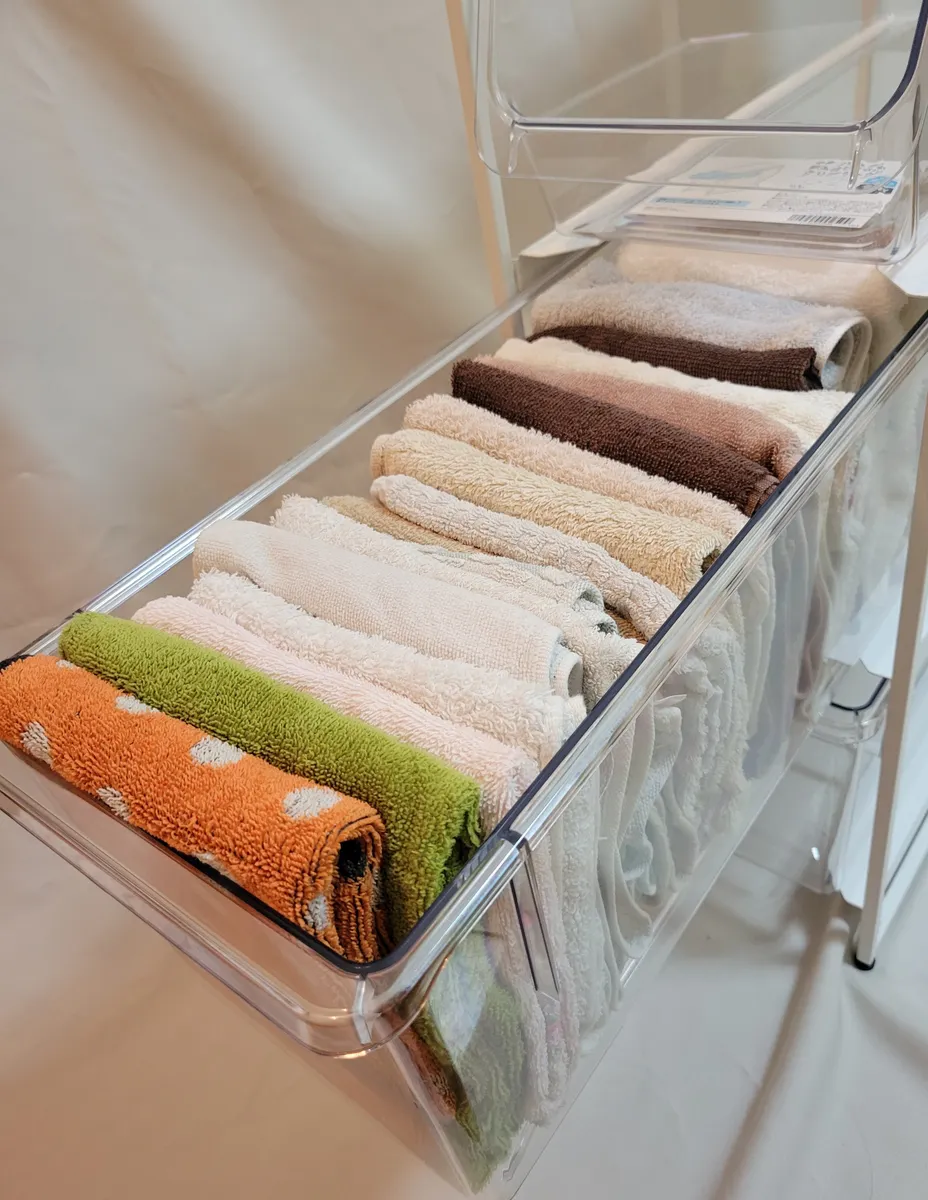 こちらの商品は、中身を「あえて見せる収納」で即見えるのが強みな商品なので、賞味期限の管理をしたい食品関係、使用頻度を均一にしたいタオル類、使用期限のある生活用品、などの収納にも良いなぁと思ったりしました🤗