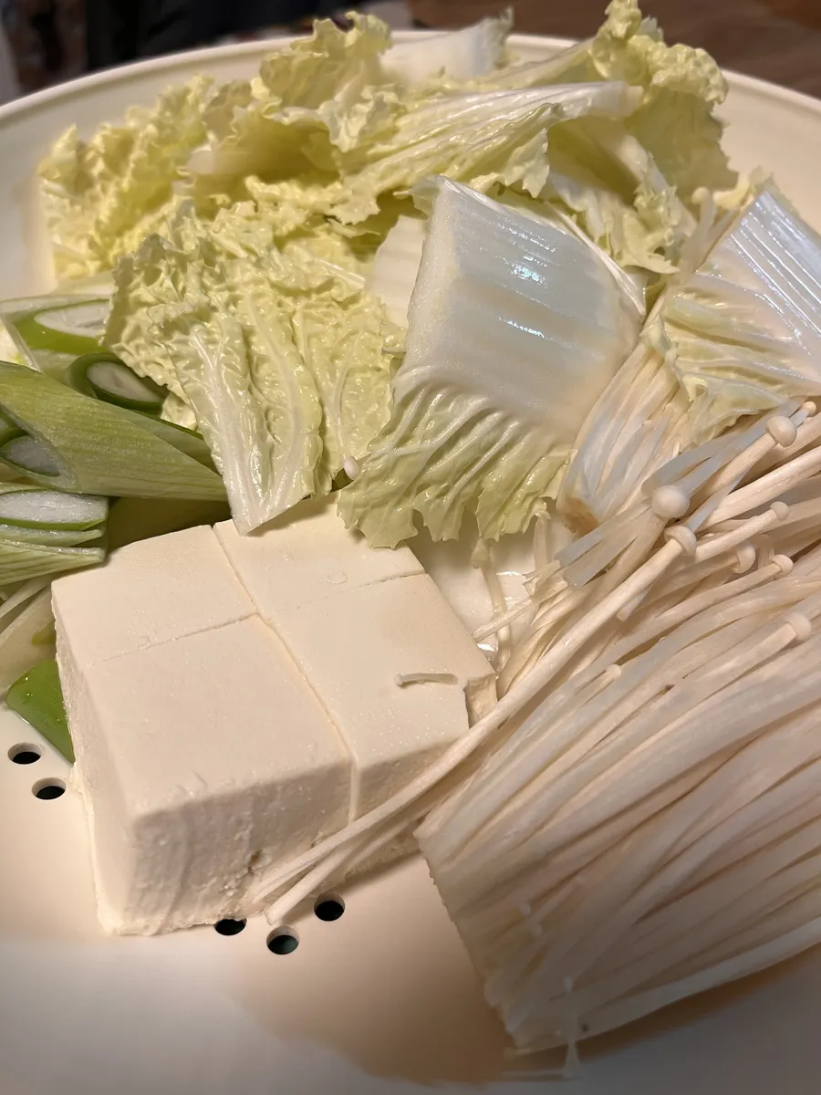 材料は、白菜、長ネギ、豆腐、えのき、エリンギです。お肉は鶏の胸肉をつかいました。