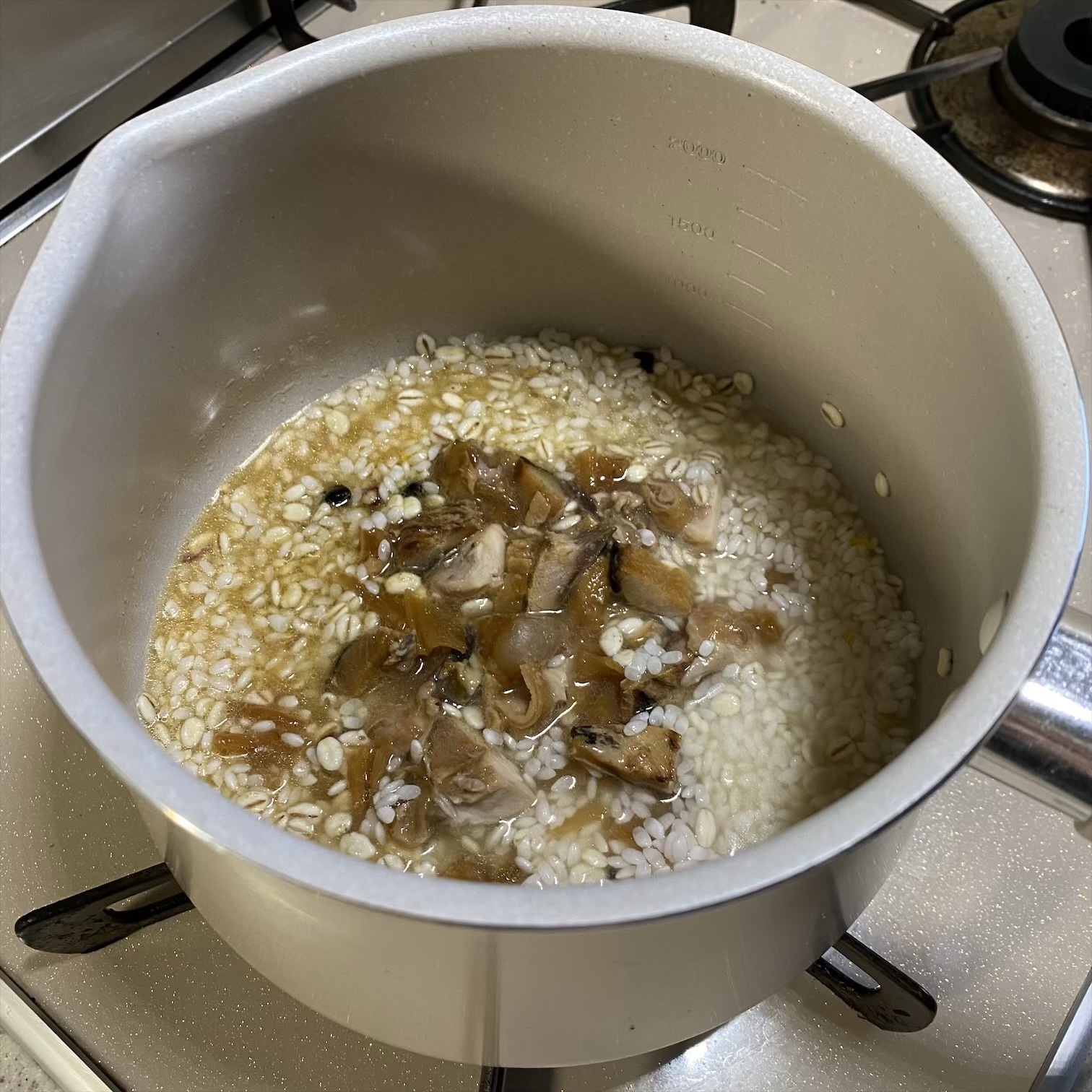けいたんさんの手羽元煮込みを堪能したあと、煮汁にいろんなものをぶち込んで先先代からの秘伝のタレを継ぎ足し継ぎ足しすることもなく、最後は炊き込みごはんになりました。