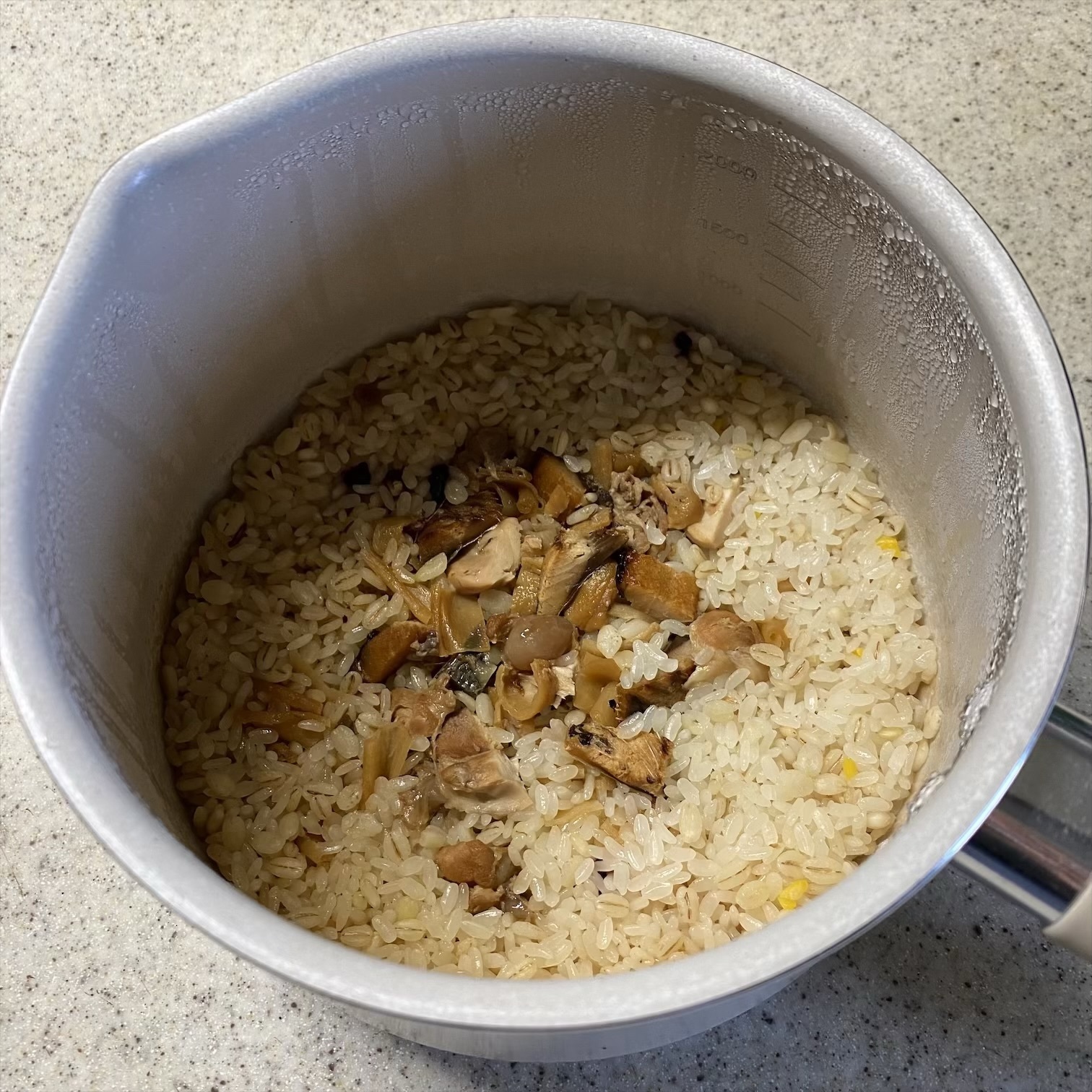 炊き上がり。少し水の蒸発が多かったので固めになってしまったけど私は固めが好きだからよしとする。