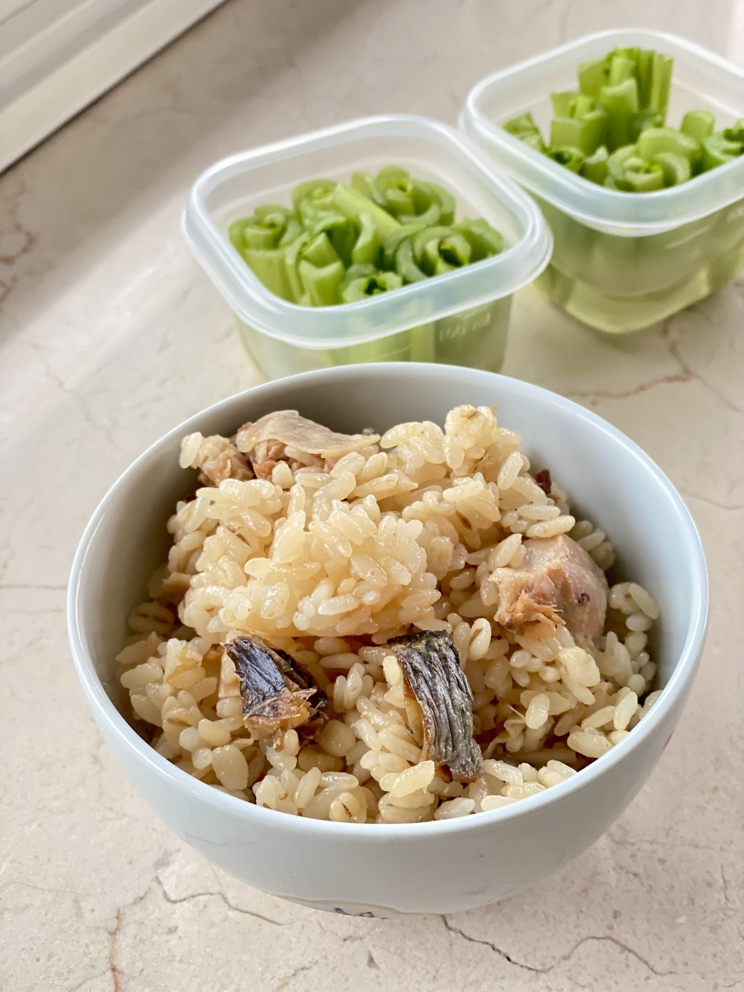 炊き込みごはんの時には分けておいた鶏手羽元と身欠きニシンの切れ端とかんぴょうの細切れを一緒に。かんぴょうって固くなるかと思ったら違和感なかった!