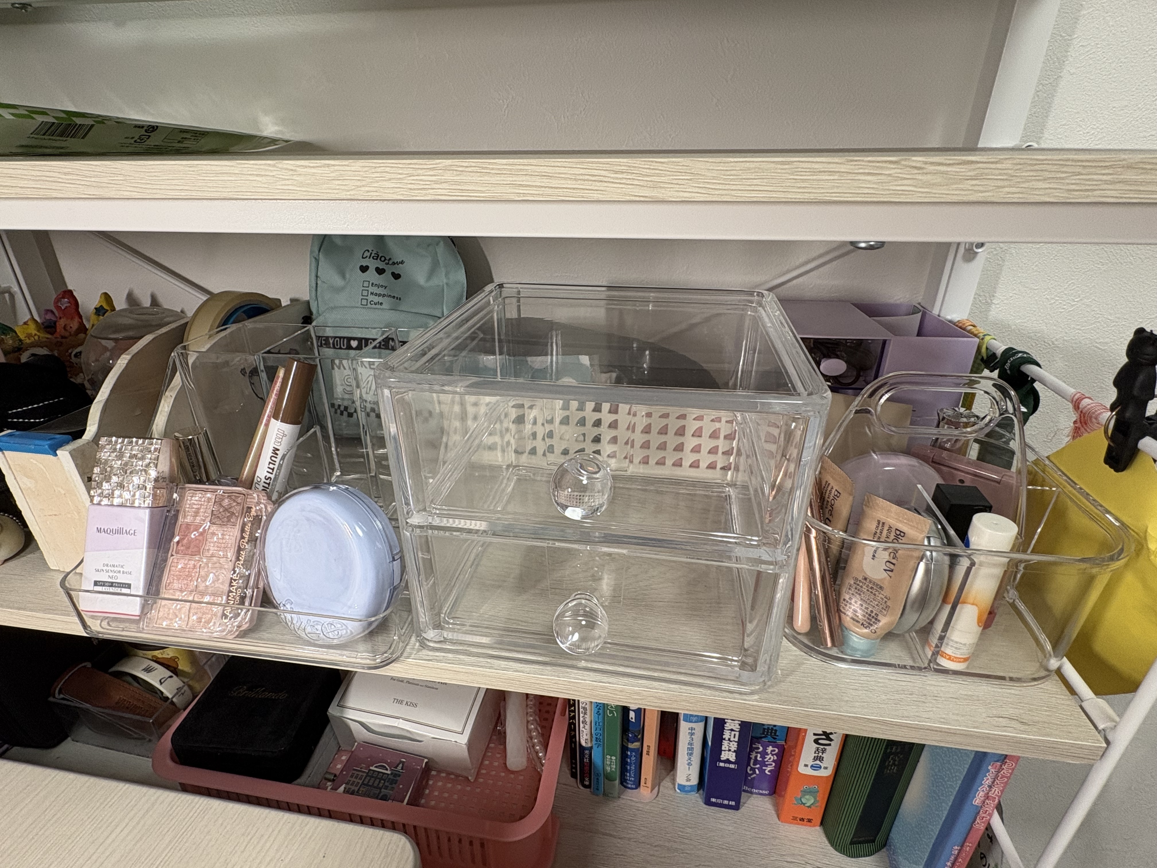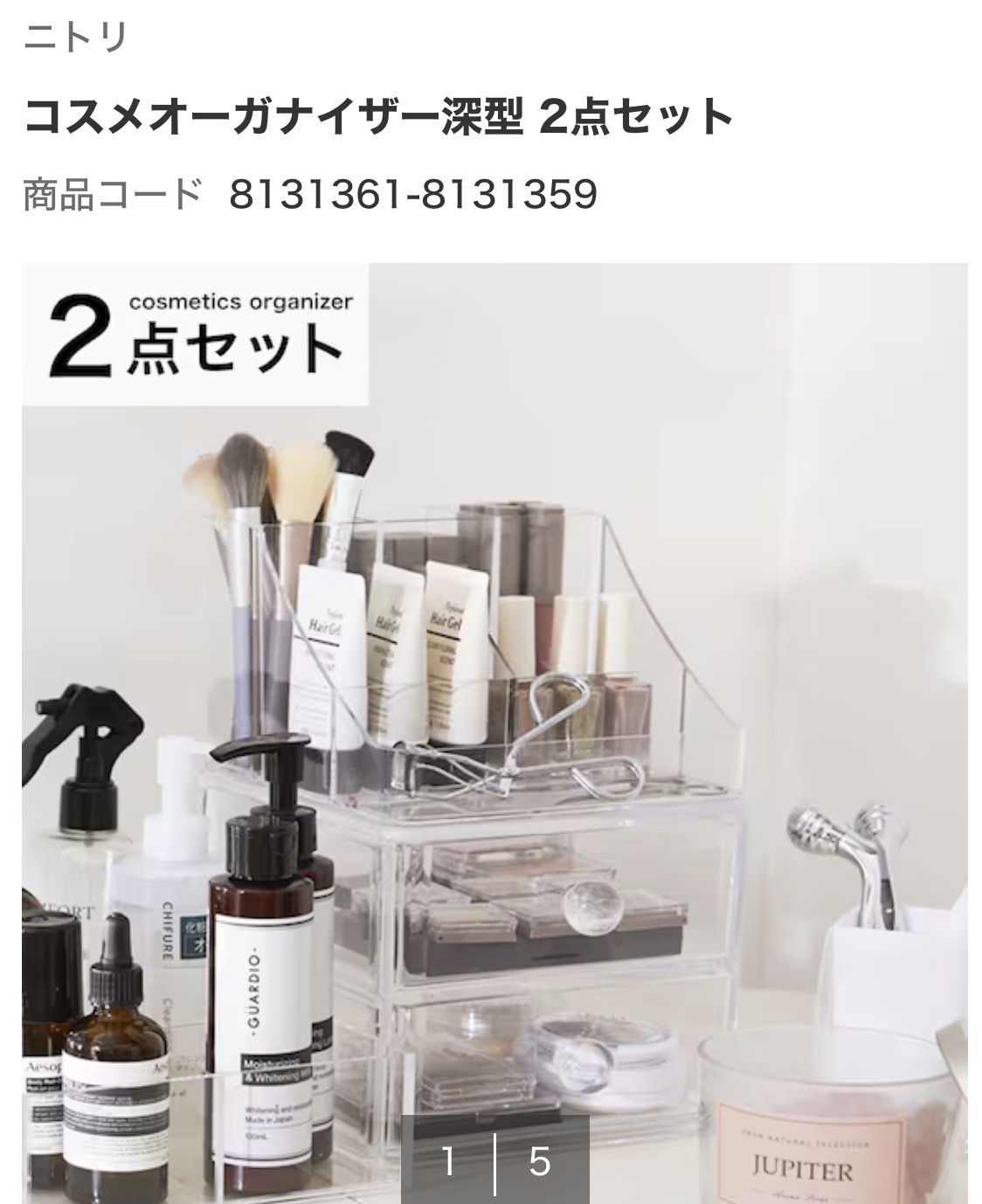 3、以前、アクリル取っ手付きスタッキングケース(5902S)https://www.nitori-net.jp/ec/product/8131319s/を買ってお化粧品を入れてましたが、容量が足りなかったのでそこに加えてコスメオーガナイザー深型2点セットも購入して、メイク道具が増えた時に使えるようにしました💄