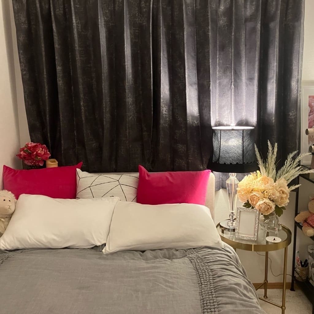 投稿を表示カーテンとベッド上のクッションのカラー、まさにエレガントなお部屋ですね❤(ӦvӦ。)