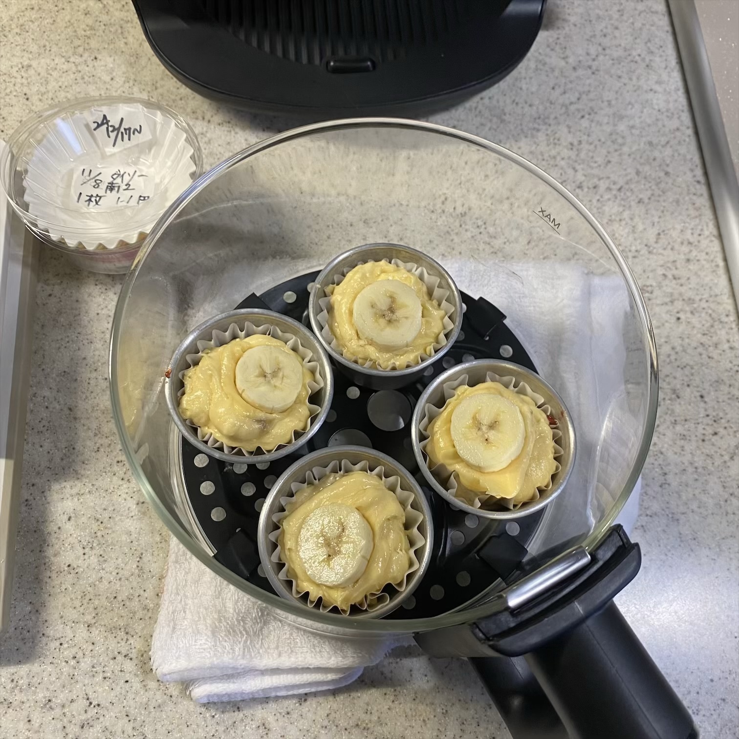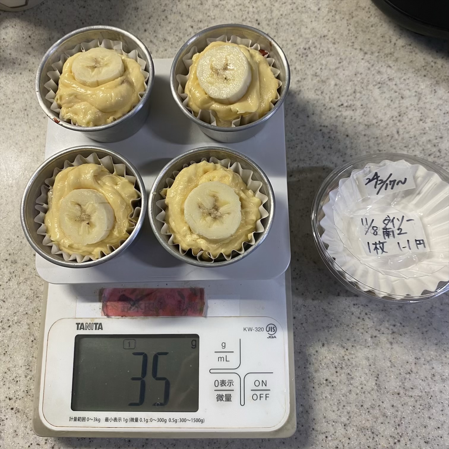 3️⃣プリンカップにダイソーで買った剥がれる紙を入れて生地を4分割。