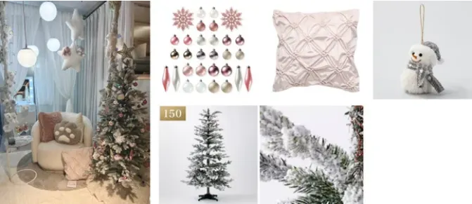 かわいい「ソフトガーリー」の空間には、やさしい雰囲気になるピンク&ゴールドのデコレーション や、ふわふわのアイテムがぴったり。今年新しく登場した、舞い散る粉雪が積もったような立体的デザ インのクリスマスツリーが幻想的な雰囲気を演出します🎄