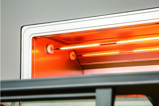 庫内上側に2本のフラッシュヒーター、庫内下側に2本の石英管ヒーターを搭載し、庫内の温度を一気に上げます。ヒーターの発熱箇所を最適化しているので、全面をムラなく短時間で加熱できます。庫内温度を100℃~260℃の範囲で調整できるので、トースト以外の調理でも活躍します。