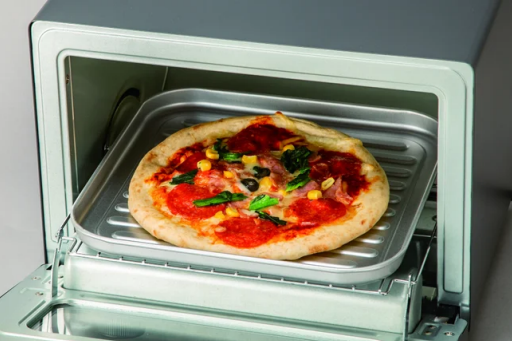 幅約27.5cm、奥行約26.3cmのひろびろとした庫内は食パンを4枚同時に調理可能。直径23cmのホールピザをまるごと焼くことができる大きさです。調理用受け皿も付属するので、形が崩れやすいものも加熱調理できます。※ 形状(山切りパンなど)や置き方(縦向き、横向き)によっては入らないことがあります。