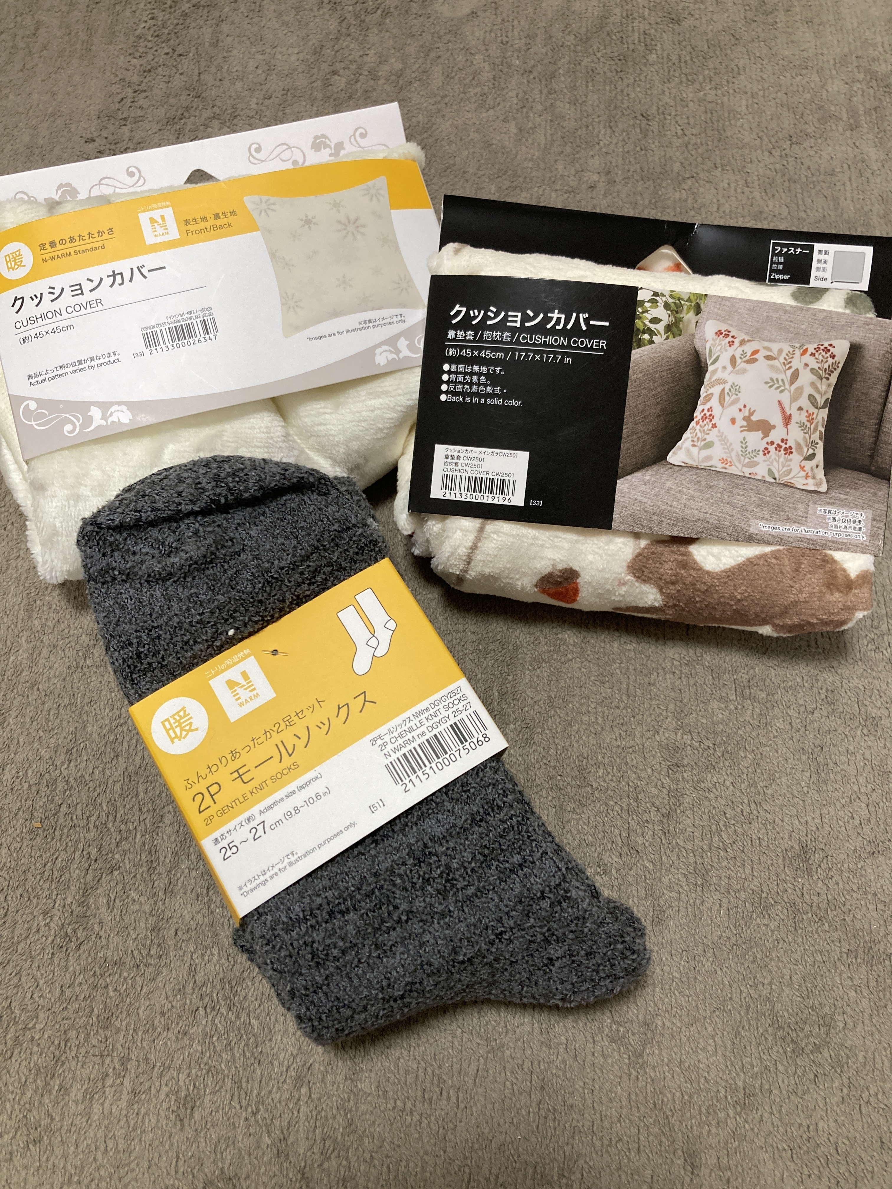 今日店舗受け取りでもらってきたクッションカバー(と靴下)です。