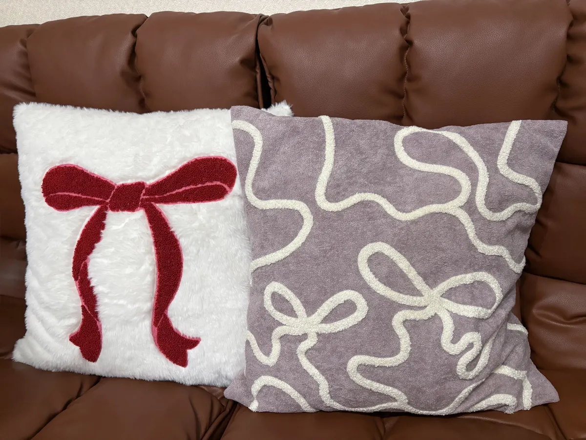私も冬用クッションカバー買ったけどこの白地に🎀買えば良かったぁ。最後まで悩んだけどもう一つを買っちゃった😅