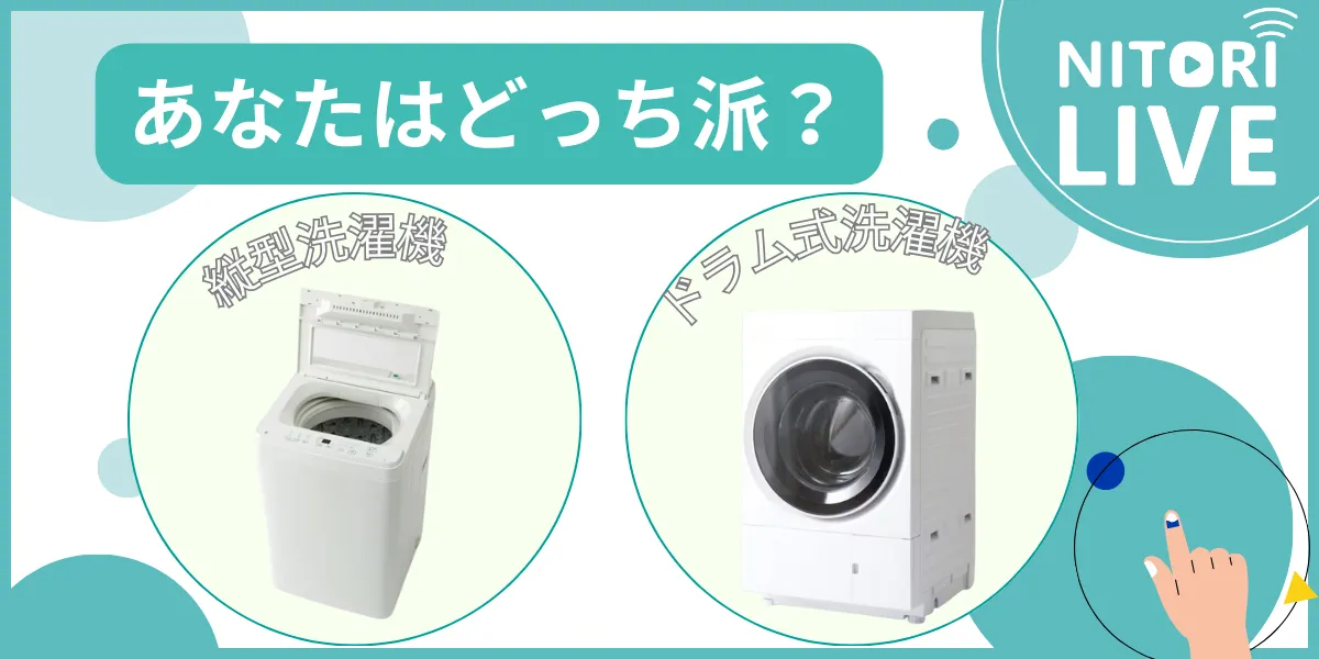ニトリで人気の洗濯機は、大きく分けて「縦型」と「ドラム式」。あなたはどっち派?
