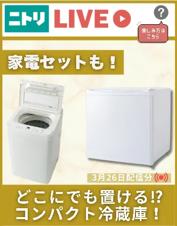3/26(水)ニトリLIVE 「どこにでも置ける!?コンパクト冷蔵庫!家電セットも!」
