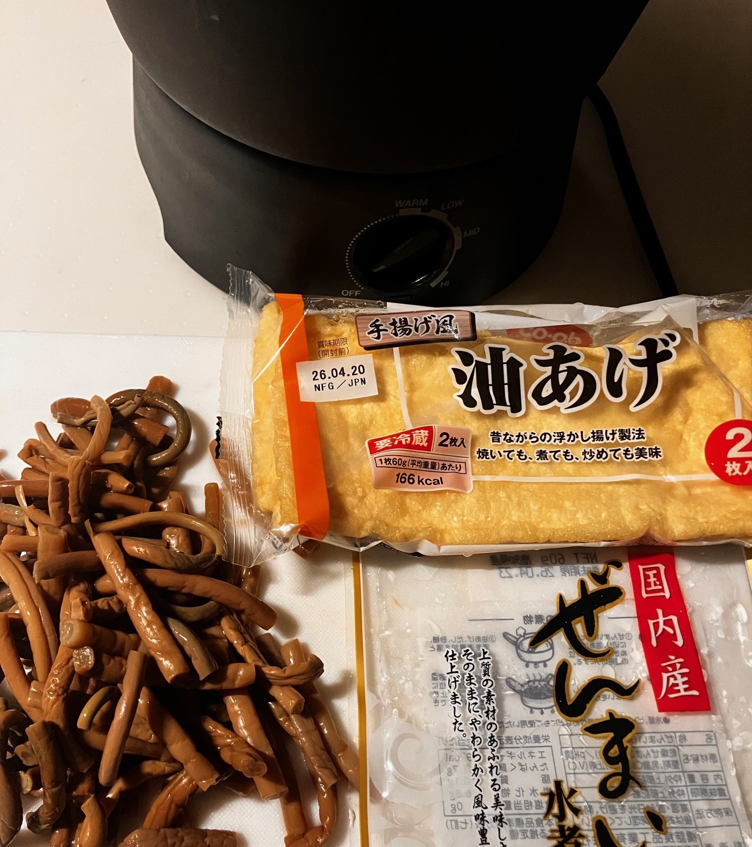 ゼンマイ水煮2袋 お揚げさん1袋 ごま油 醤油 砂糖 出汁