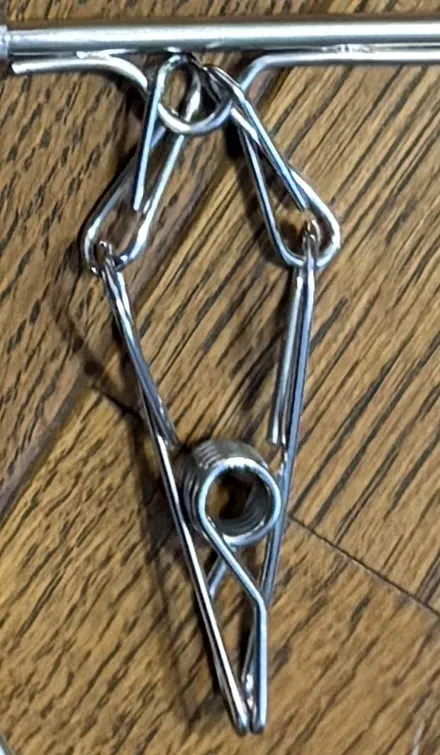 上のお写真↑は従来のステンレス物干し、下のは省スペース物干し。従来のはピンチと本体の結合部分が輪っかになってて、重いものを干すと、輪っかが広がって歪な形になり、ピンチが落下⤵⤵⤵