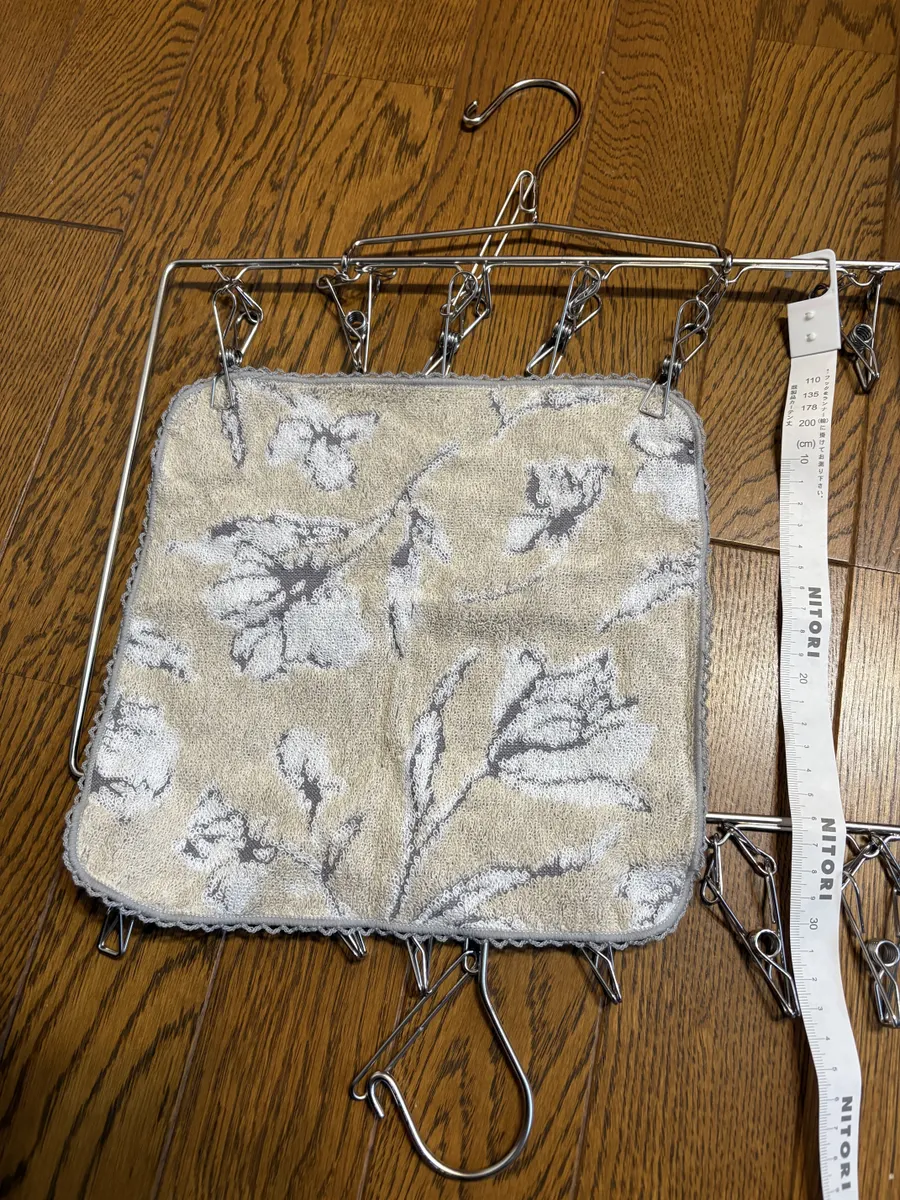 省スペースだけど、一体どれくらいの大きさの物が干せるんだい?ってことで、ニトリ製タオルハンカチを干してみました!ニトリ製タオルハンカチの大きさをご存知ない方のために、ニトリカーテンコーナーで無料で頂ける、紙メジャー(通称、神メジャー)も並べてみましたよ👀📏✨だいたい25cmくらいまでの物が干せます☺️
