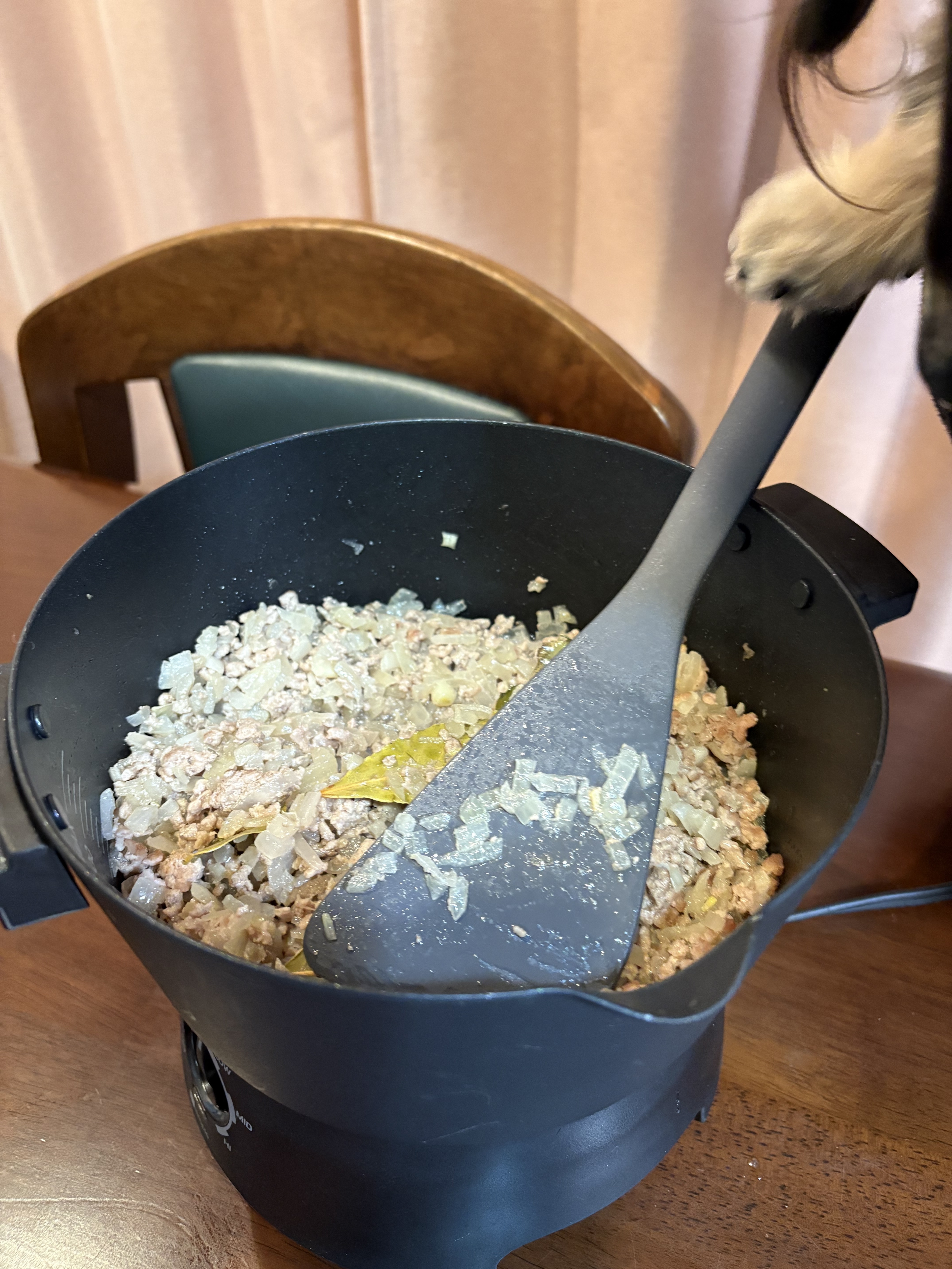2.[一台10役マルチ調理ポット]に合挽きミンチ150g、細かく刻んだ玉ねぎ1/2個を入れて炒め、塩胡椒します。