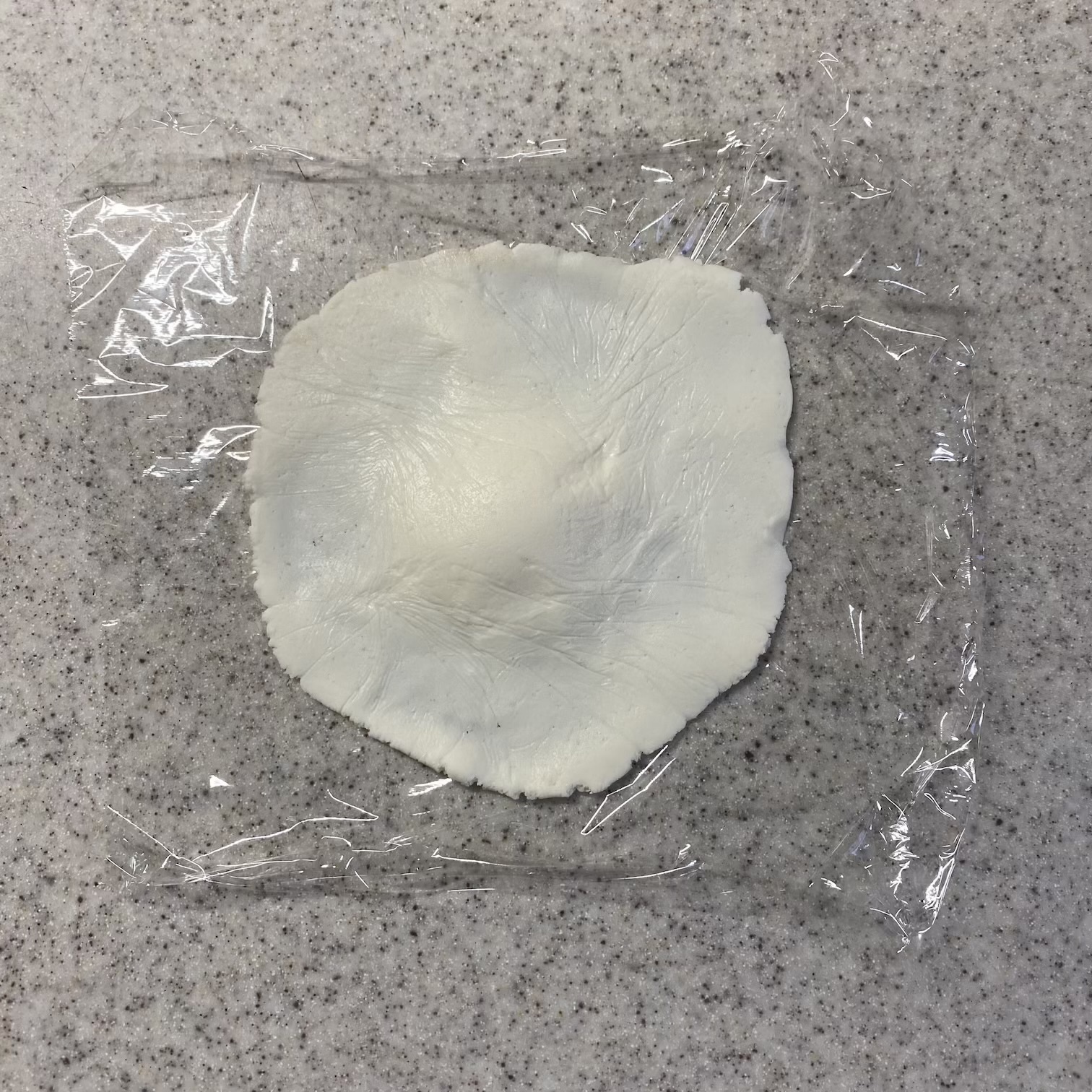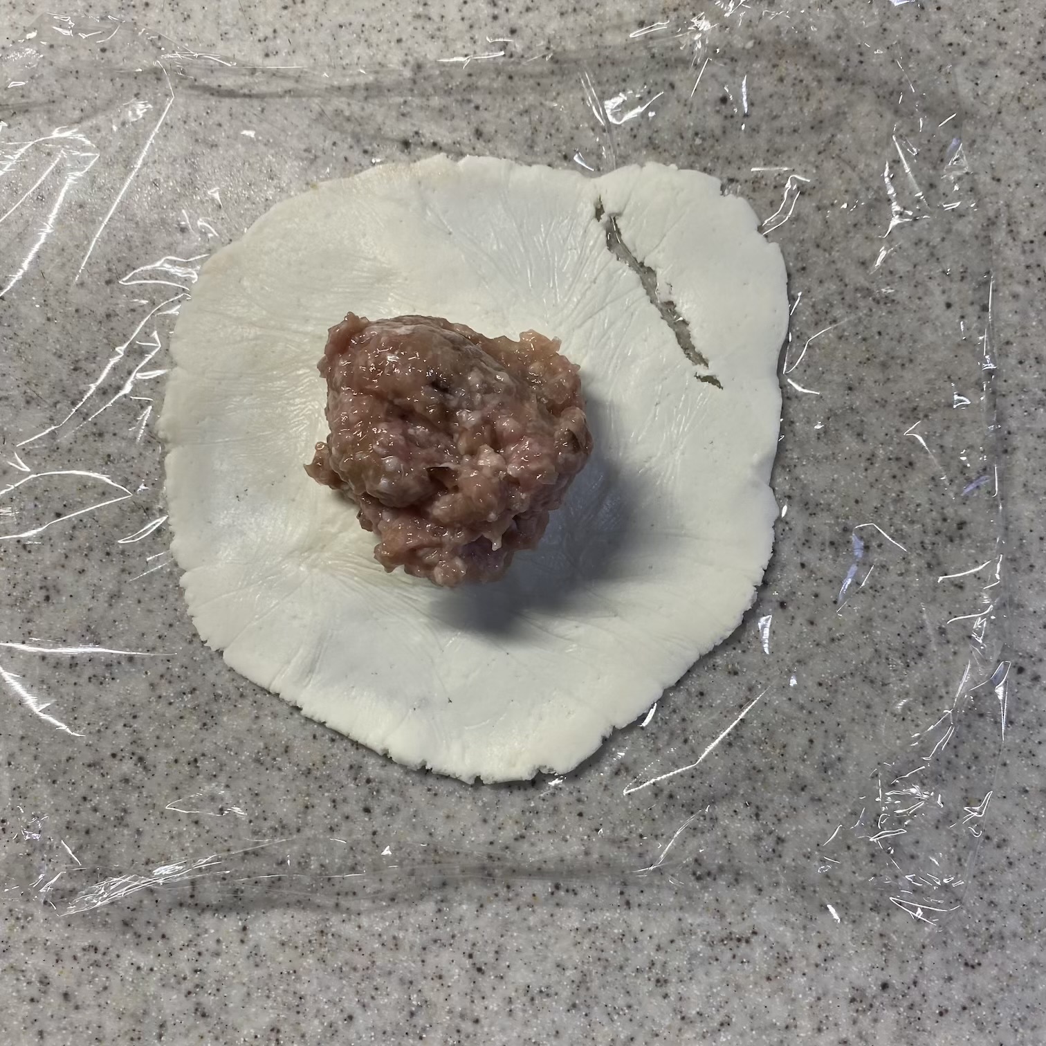 皮も4等分してラップで挟んで伸ばす。真ん中を厚くする。