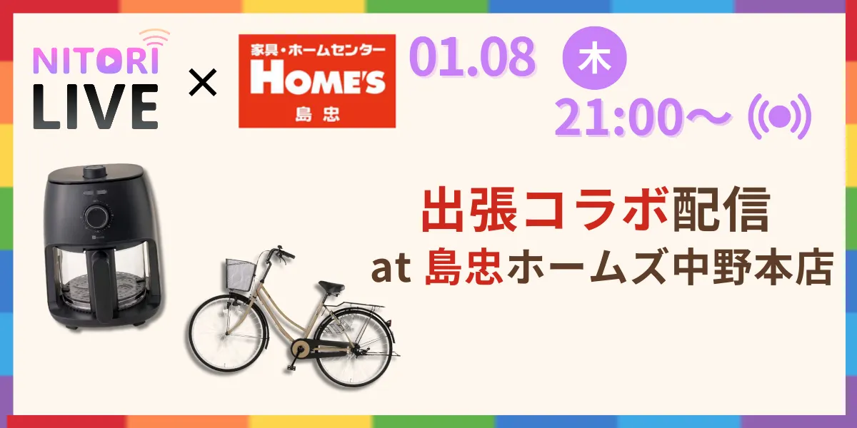 1月8日(木)21:00~:コラボLIVE「島忠の自転車&ニトリの新商品家電も!」