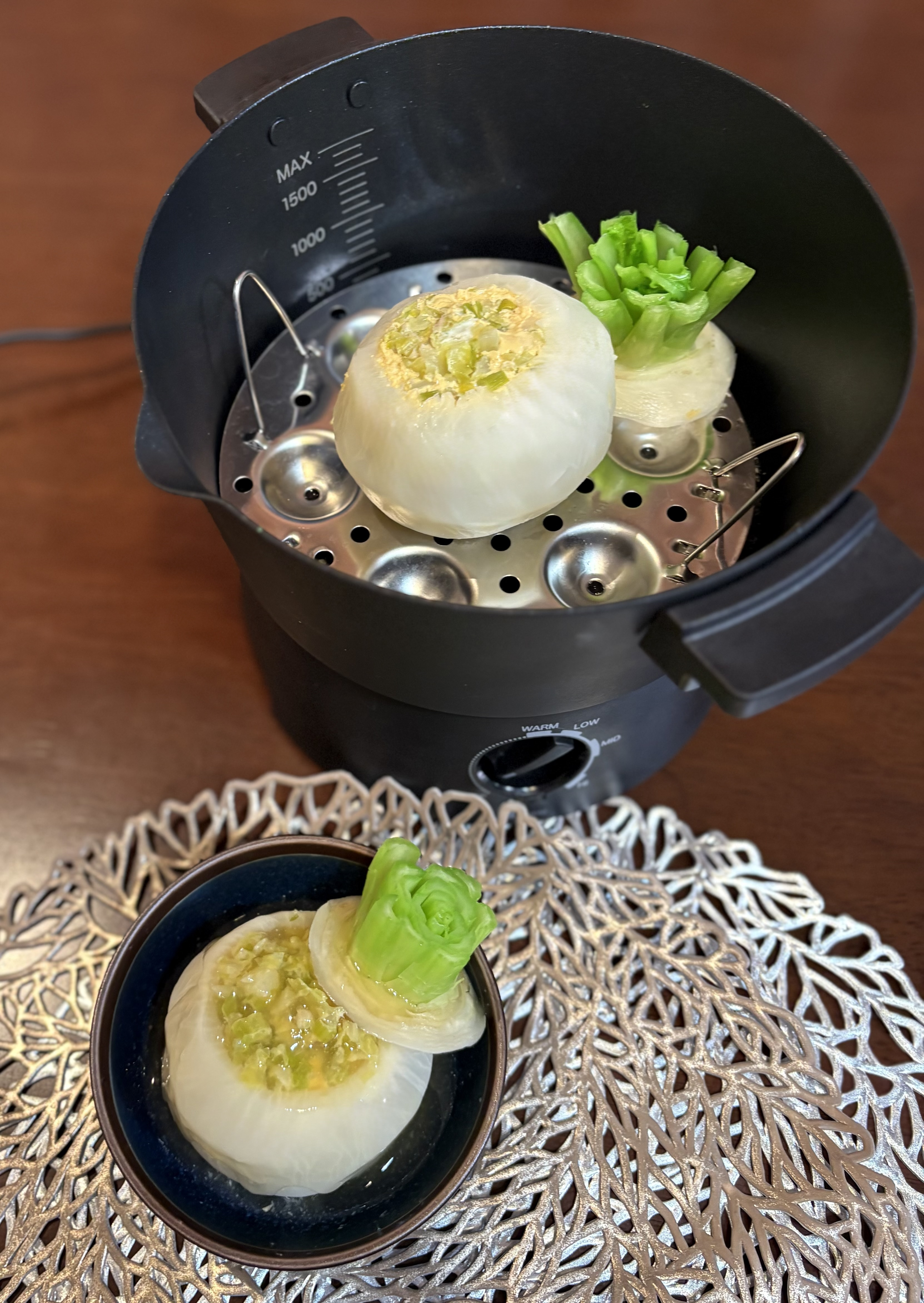 4.[一台10役マルチ調理ポット]に蒸し用のトレーをセットし、水を入れ、カブを載せてMIDで10分蒸します