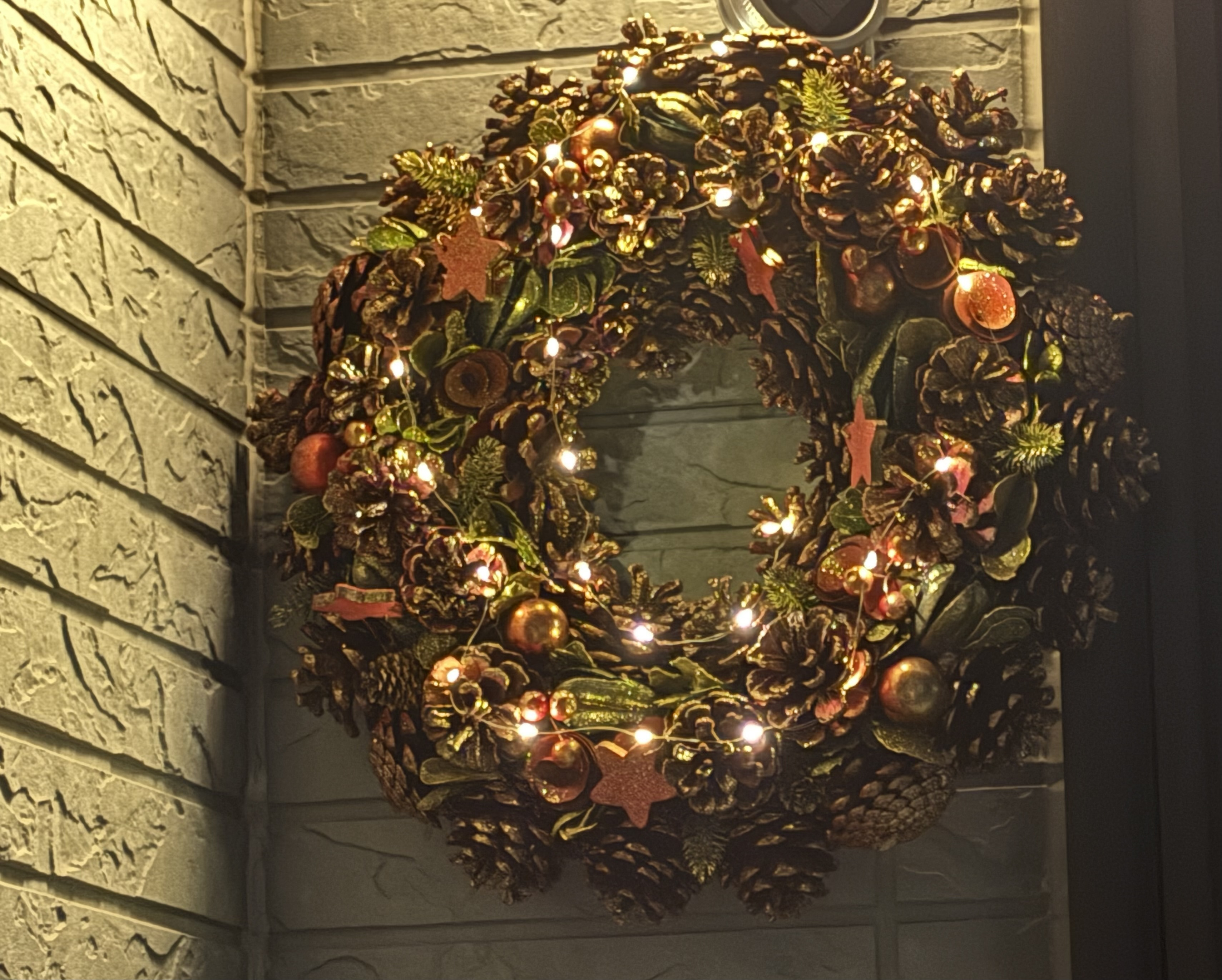 リースにソーラーライトを巻き付けて、より煌びやかに✨