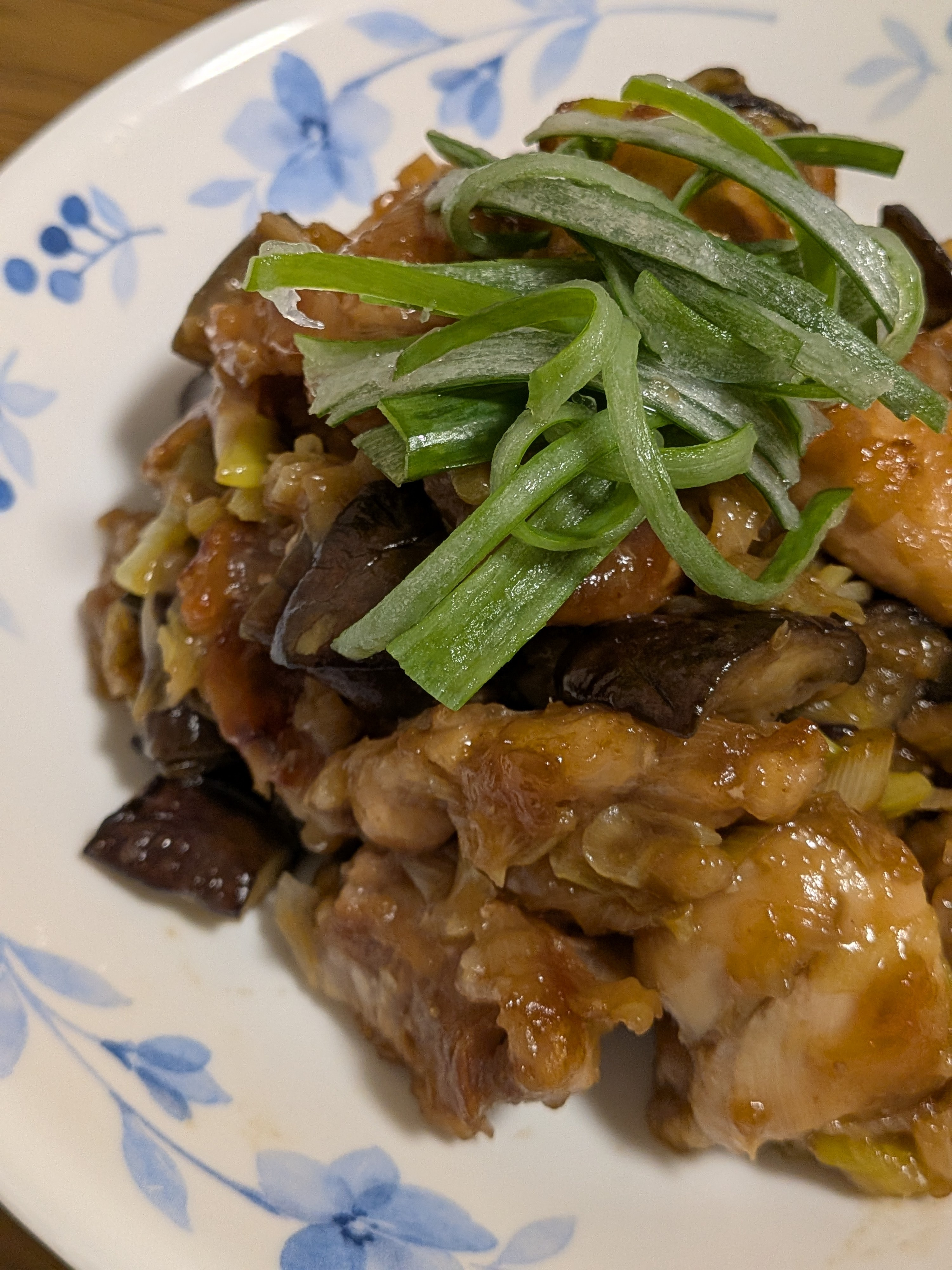 ③フライパンにごま油を敷いて広げる。中火で鶏肉を焼いていく。焼き目がついたらひっくり返してナスを加えて炒める。