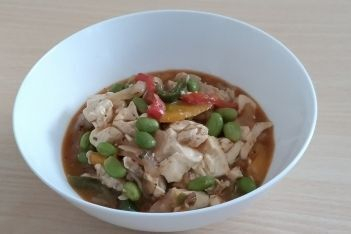 具:木綿豆腐2・枝豆・玉ねぎ・パプリカ・鶏挽き肉