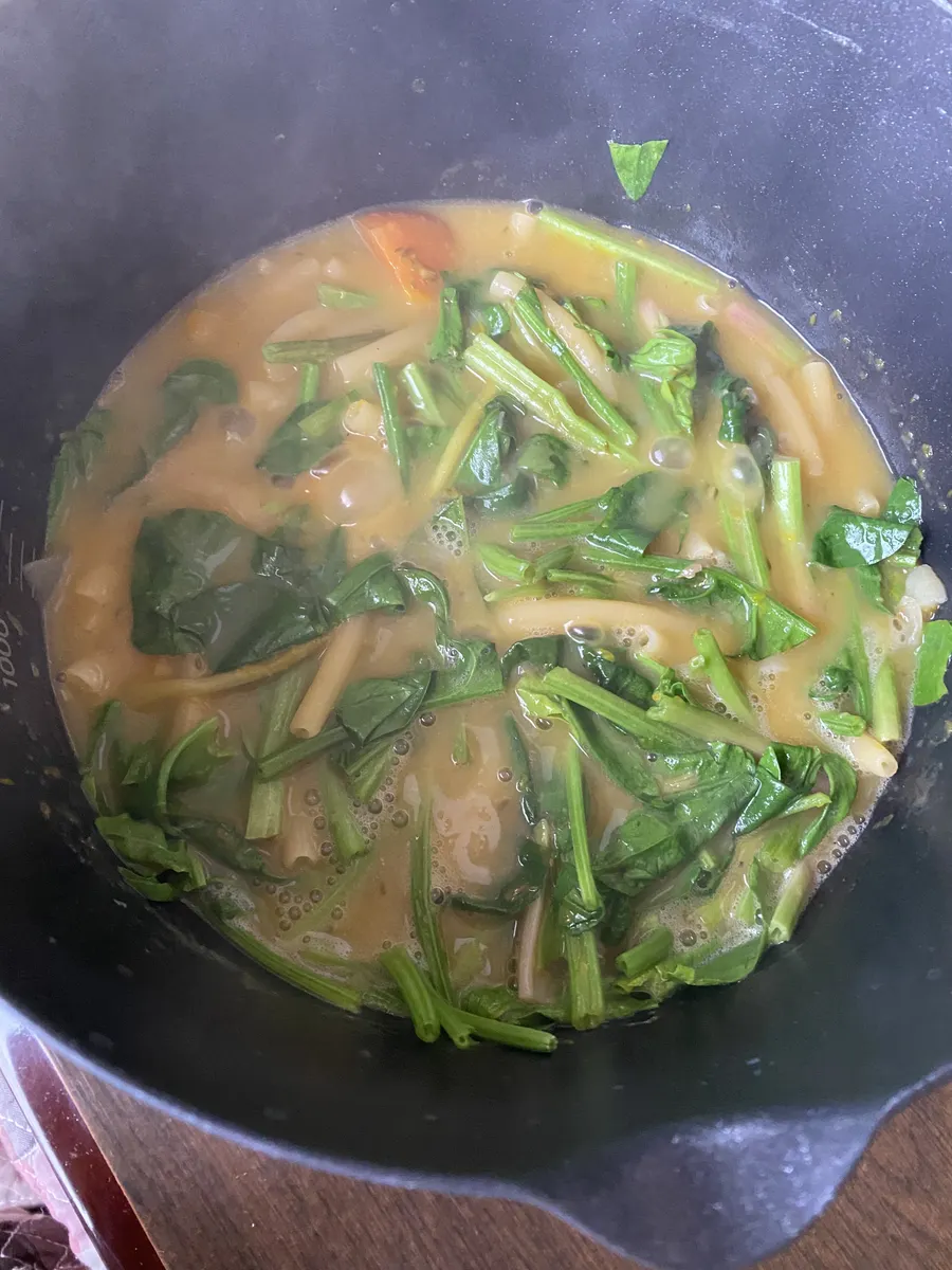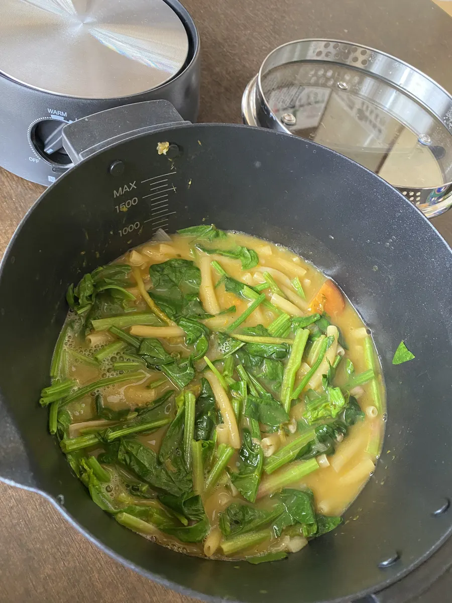 もう3分煮ると決めて、ほうれん草をひと束追加