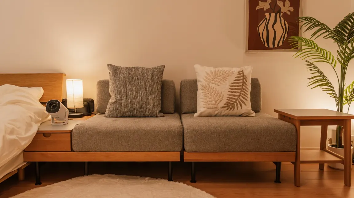 左右入れ替えや、組み合わせもできる置き方自由なソファ。テーブル奥のふた式収納部分は配線用の穴もあるので、ごちゃごちゃしがちな照明のコードや充電ケーブルも隠してスッキリします。