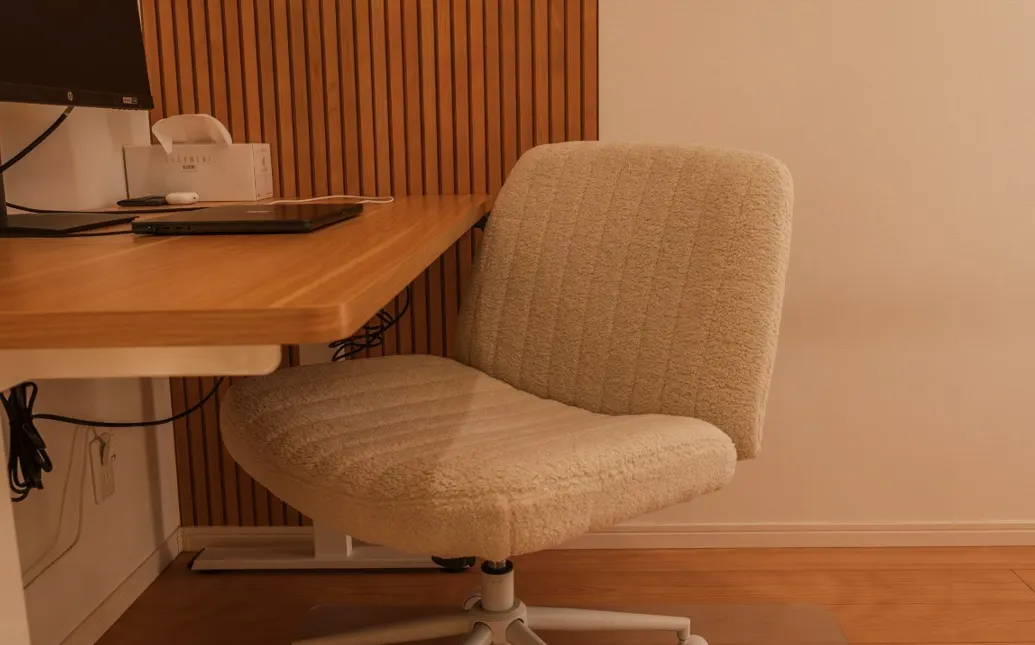 座面が広いのであぐらもかけてゆっくり座れるオフィスチェア。モコモコとしたシープ調の生地で、お部屋にやわらかい印象を与えてくれます。