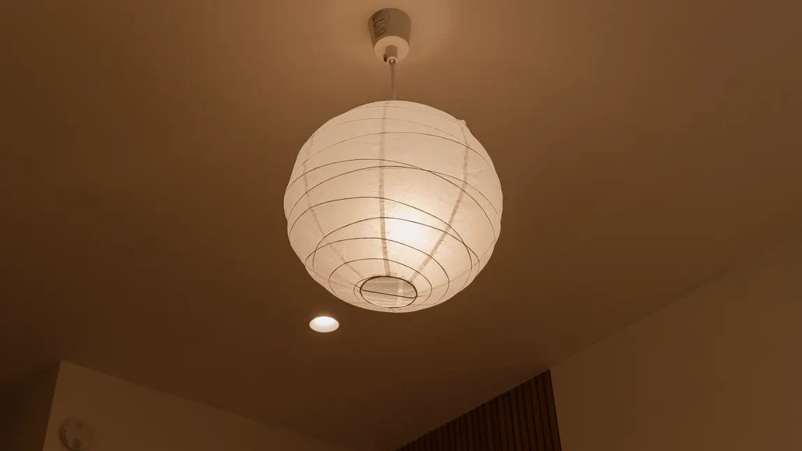 和紙のペンダントライトや、紙を使用した和風モダンなテーブルランプを使用。お部屋を柔らかく明るく照らしてくれます。