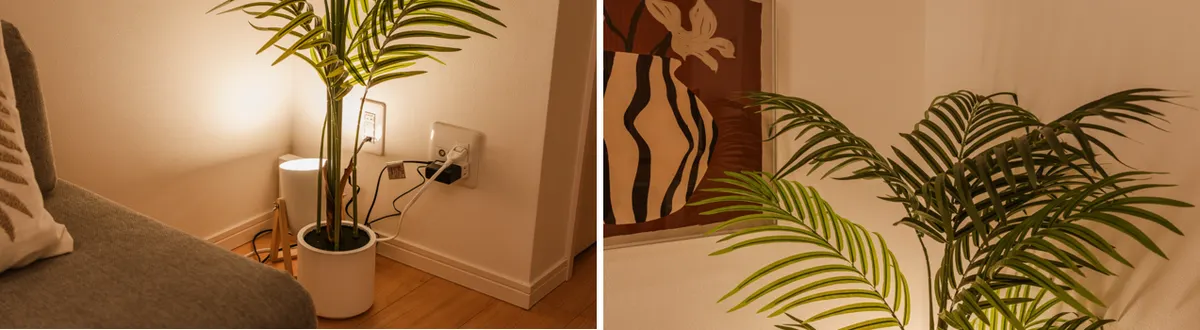 もう1つのテーブルランプ(テーブルランプ テアトル)は、アッパーライトとして観葉植物側そばの床に。植物のシルエットが出て雰囲気を演出してくれます。