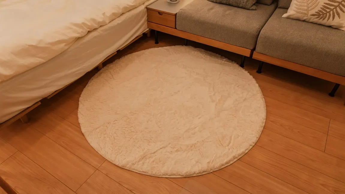 ふわふわのさわり心地で、お部屋のバランスを整える円形が今回のコーディネートのポイント。