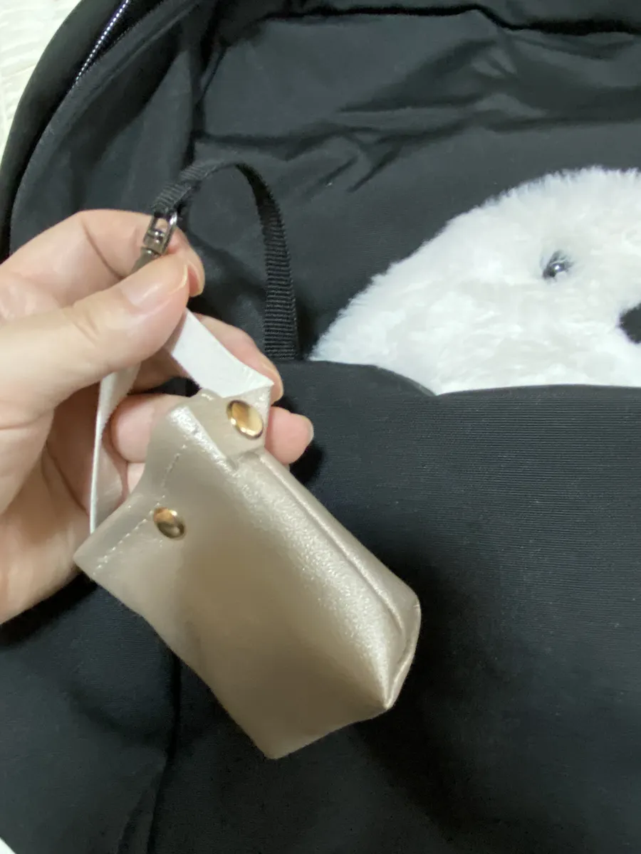 前面にある🤐にはフック紐が付いてるので落としたく無い物を付けられる仕様です。バスなどの定期とか持っている人は特に需要ありそう。