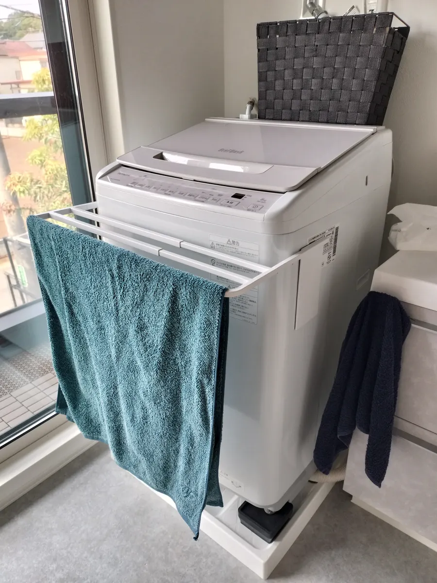 タオルをかけるのはもちろん、ちょっとドライヤーやブラシだったり、お風呂後の着替えをを置いとく台替わりにもなってます。