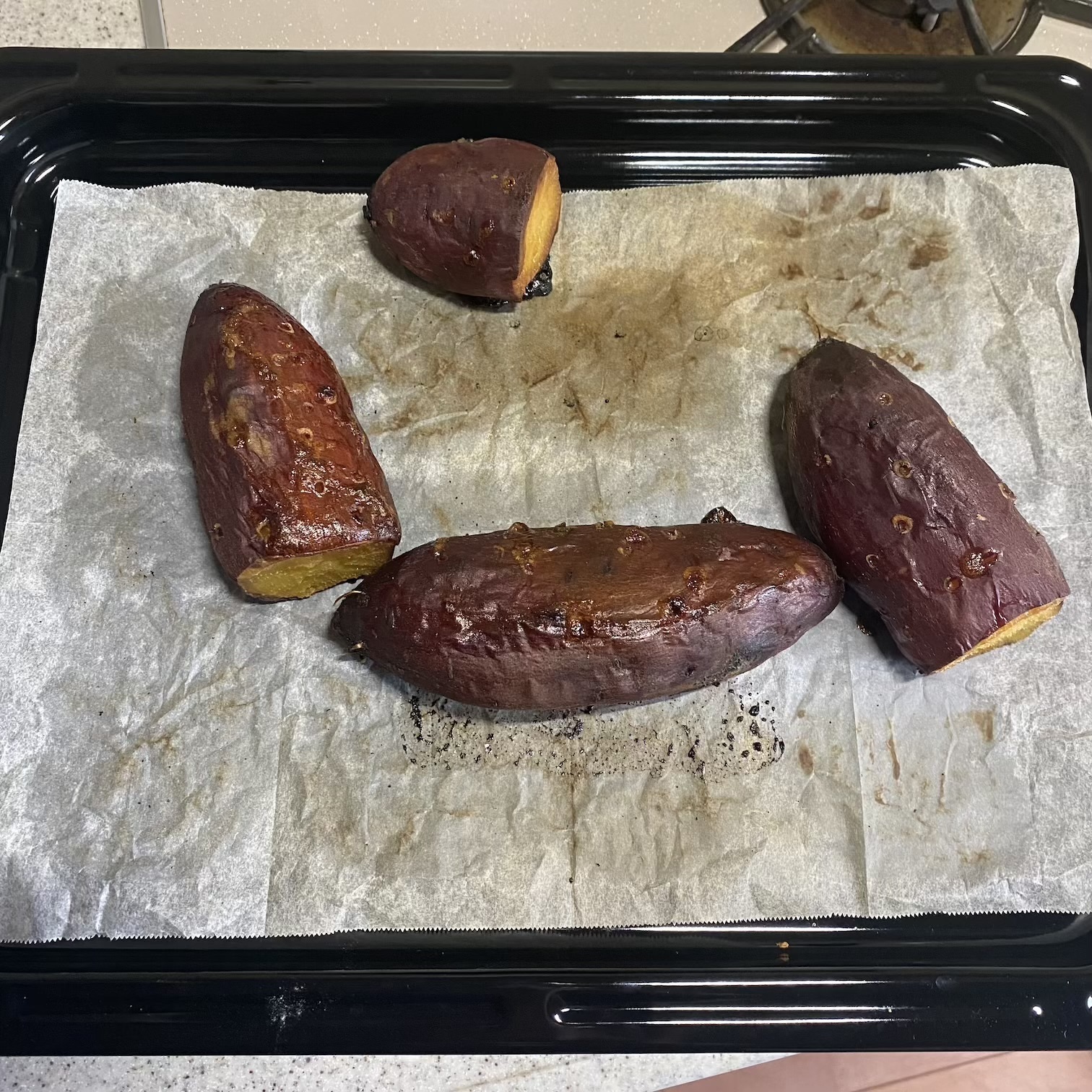 4️⃣オーブン210~220℃で30分くらい焼く。穴からさつまいもの中の蜜が流れ出てくる。