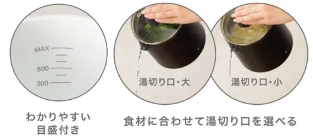 容器内側には300mL~800mLまで100mL単位で目盛りがついており、計量カップで水の量を計る必要 がありません。ふたには大小の湯切り穴がついているので、パスタや野菜を茹でた後にざるを用意する 必要もありません。洗い物を増やさずに調理できます😊