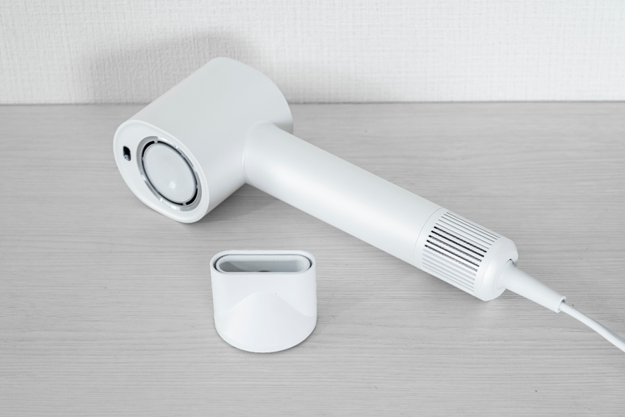 また、付属しているフードの着脱も簡単です。フードはスタイリング時に便利なアイテムで、使用すると風の当たる範囲が狭くなり、一部分の髪のクセを伸ばしたり、髪を立ち上げてボリュームを出したりするのに役立ちます。全体的に髪を乾かすときはフードを外し、スタイリング時にフードを使う方には、手軽に取り付け・取り外しができるのでとても使いやすいです。