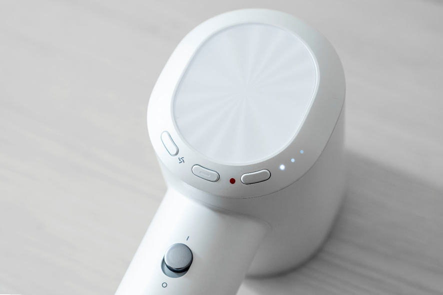 操作はシンプルで、吹出口の裏側に並ぶボタンで調整できます。風速、温度、ソフトケアモードの3つのボタンがあり、風速と温度はそれぞれ3段階で調整可能。例えば、「風速は強で風温は弱」「風速は中で風温は冷風」など、自分の好みに合わせた乾燥ができます。他のドライヤーではモードが調整しにくいものもある中、自由に設定できるのはうれしいポイントです。
