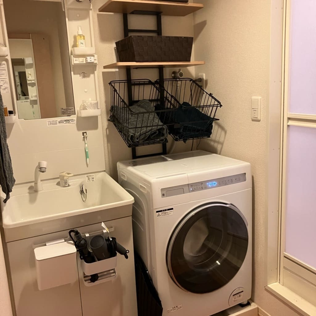 ​1人暮らしの賃貸。地面に物があまり置けない狭い洗面所。洗濯乾燥までできるドラム式洗濯機を中心に洗濯機ラックや引っ掛けて使えるゴミ箱、ドライヤーホルダーを用いることで空間を立体的に有効活用し、狭いながらも不便のない洗面所を実現しました。