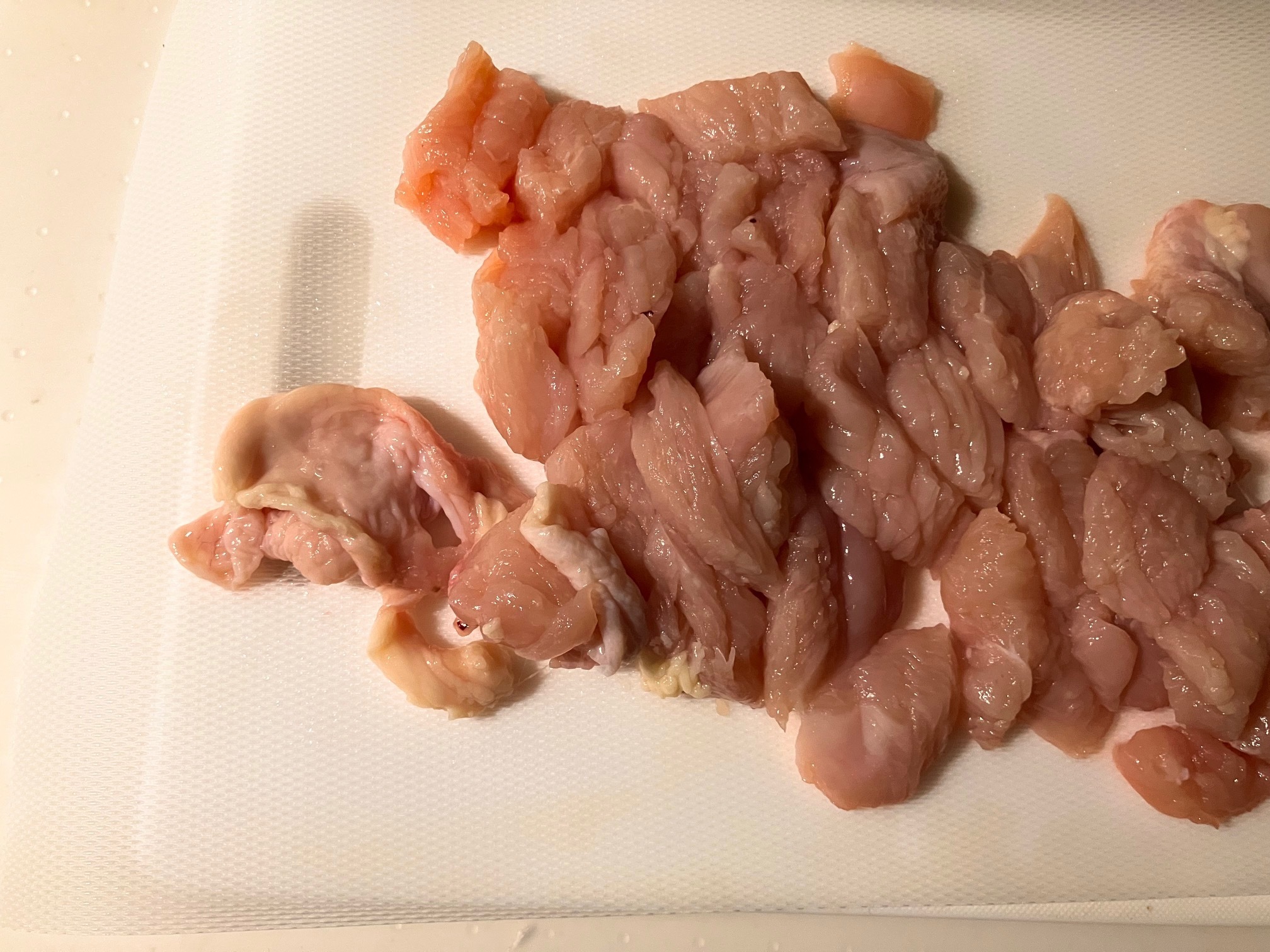 ①まな板シートhttps://community.nitori-net.jp/announcements/mw69zf2ucv6y5fn6/edit/8973393を敷いたまな板の上で🐔鶏むね肉を一口大にカット