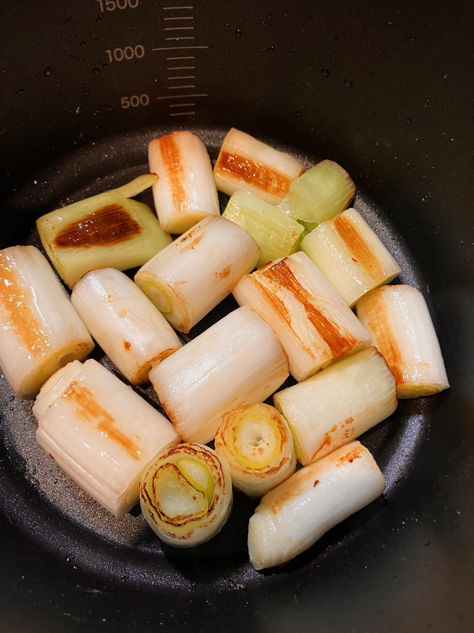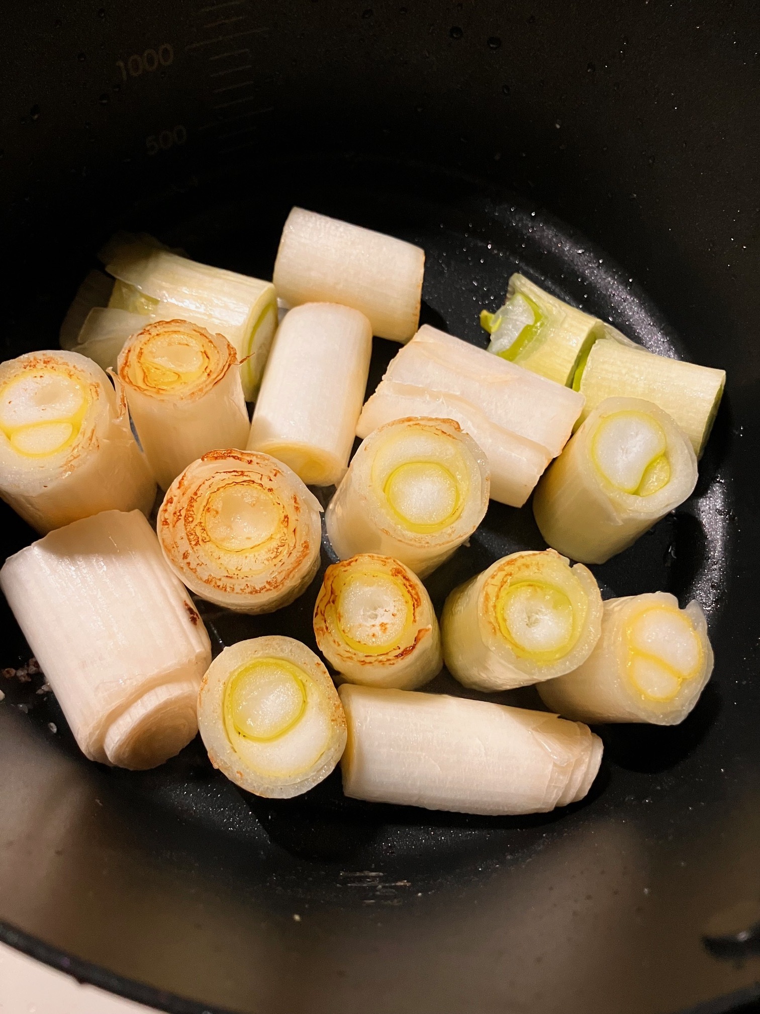 ④鶏肉を揚げ終わったら 白ネギを焼いていく